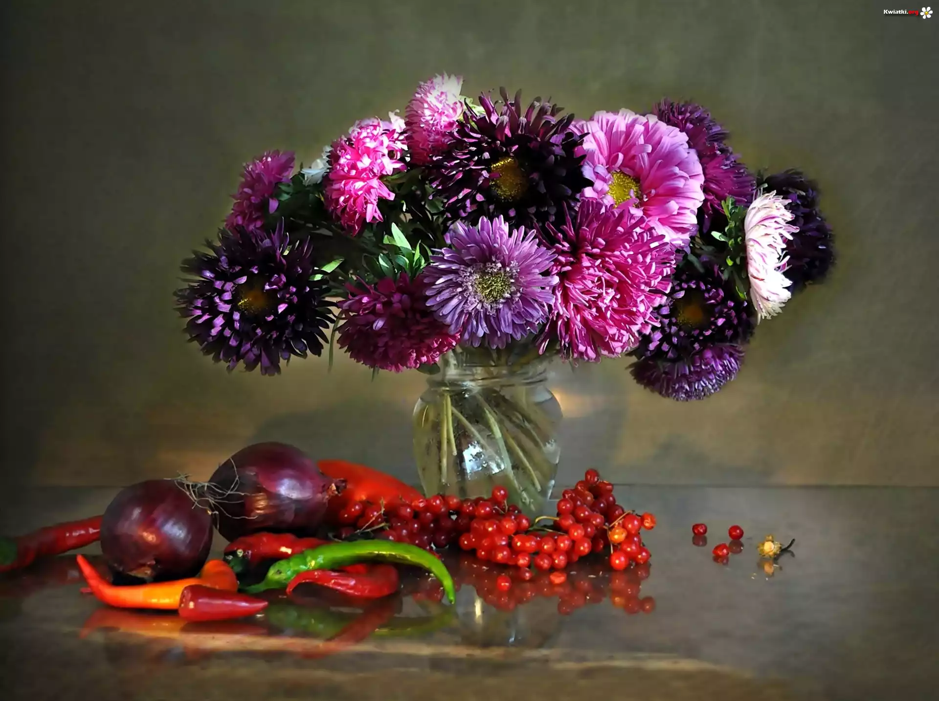 Kompozycja, Bukiet, Astry, Cebula, Papryka, Jarębina - Zdjęcia