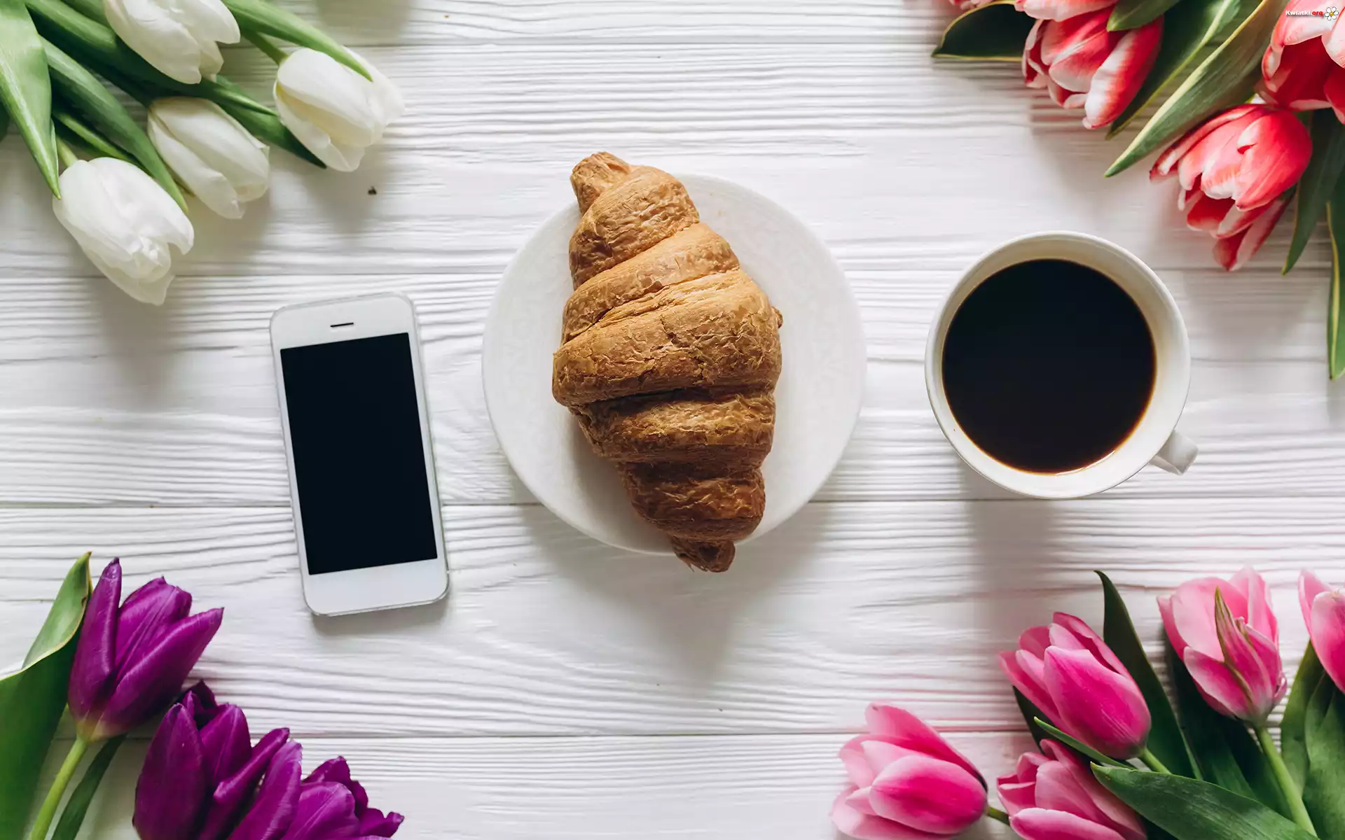 Kwiaty, Tulipany, Rogal, Telefon, Kawa, Filiżanka, Talerzyk, Deski, Kompozycja - Zdjęcia