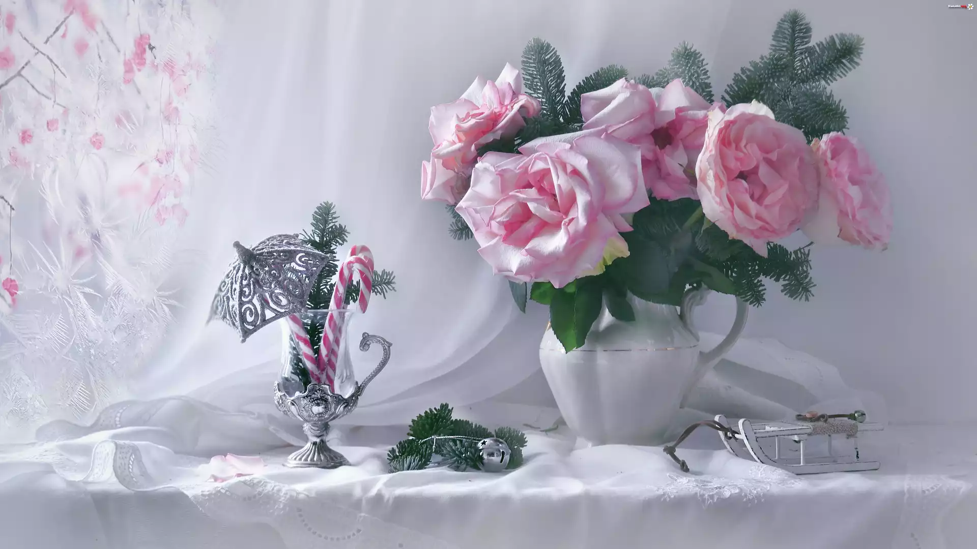 Kompozycja, Różowe, Róże, Saneczki, Szklanka - Zdjęcia