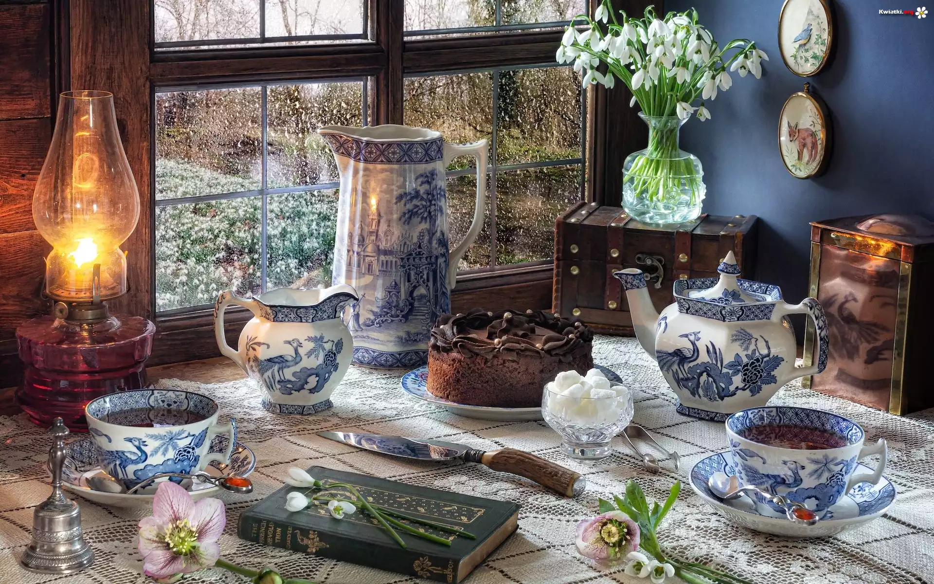 Kwiat Okno, Lampa, Serwis kawowy, Kwiaty, Przebiśniegi, Książka, Tort, Kompozycja