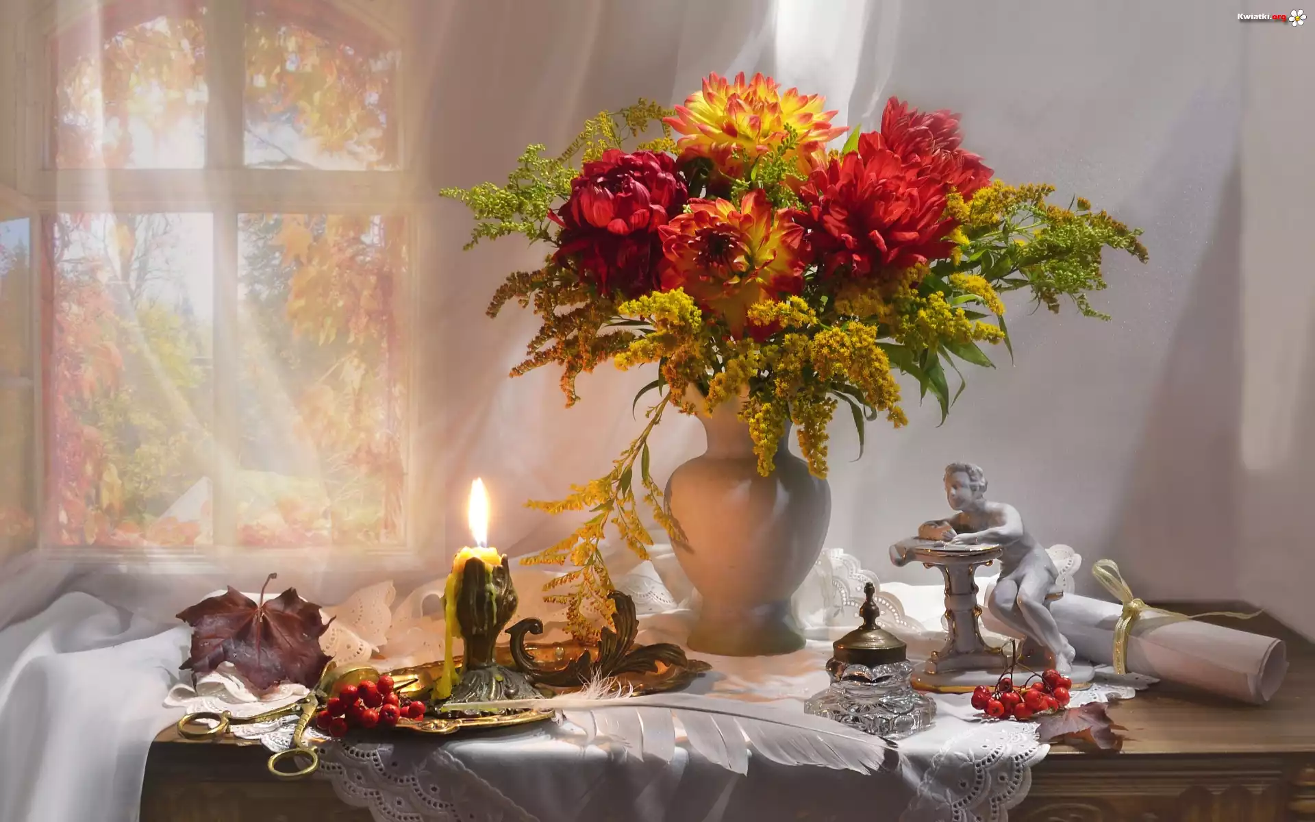 Kwiaty, Bukiet, Dalie, Nawłoć, Wazon, Okno, Figurka, Świeca, Pióro, Kompozycja - Zdjęcia