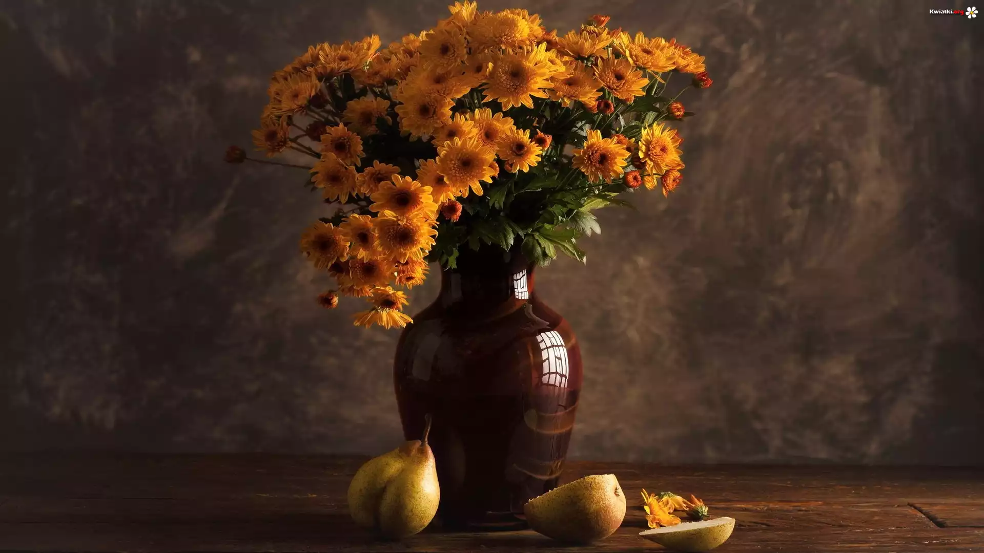 Kompozycja, Bukiet, Kwiaty, Chryzantemy, Wazon, Gruszki - Zdjęcia