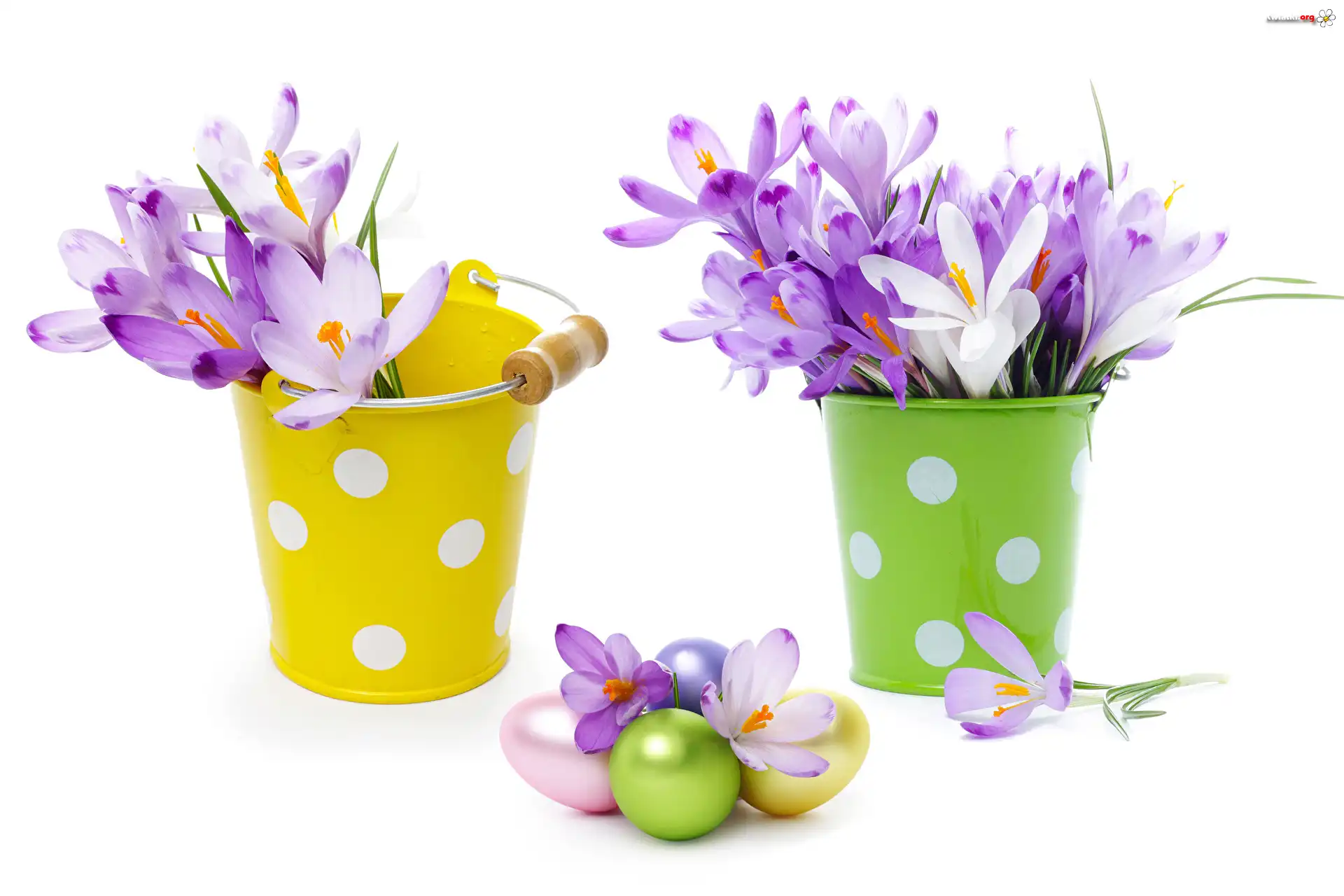 Kompozycja, Wielkanoc, Krokusy, Wiaderka, Pisanki - Zdjęcia