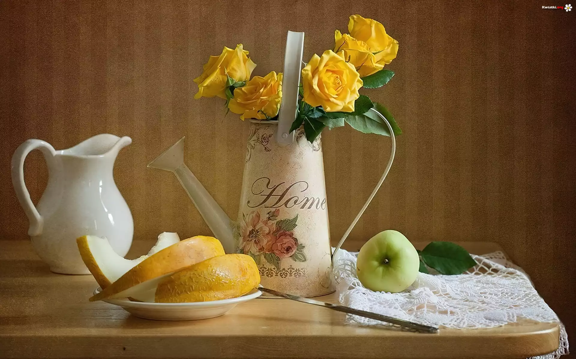 Żółte, Róże, Dzbanek, Konewka, Owoce - Zdjęcia