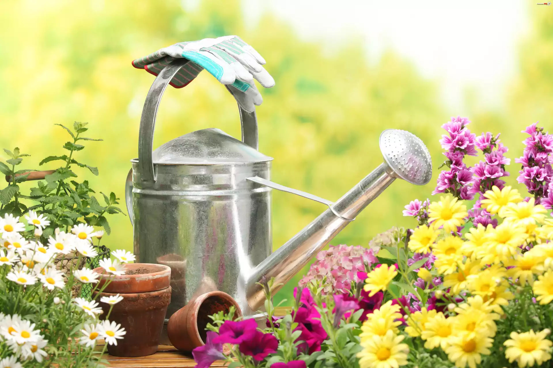 Konewka, Rękawice, Doniczki, Kwiaty, Rozmyte tło - Zdjęcia