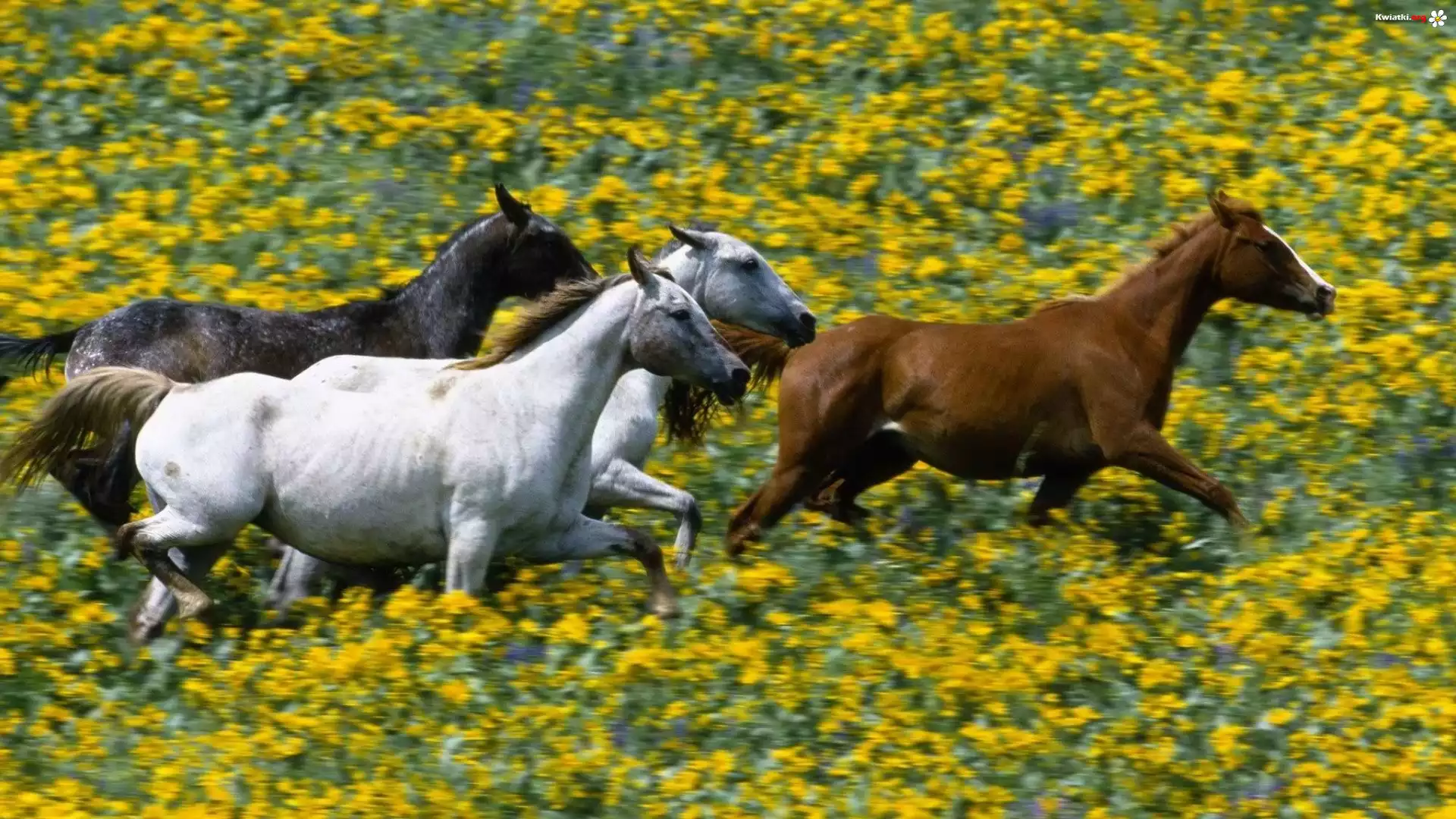 Konie, Łąka, Żółte, Kwiaty - Zdjęcia