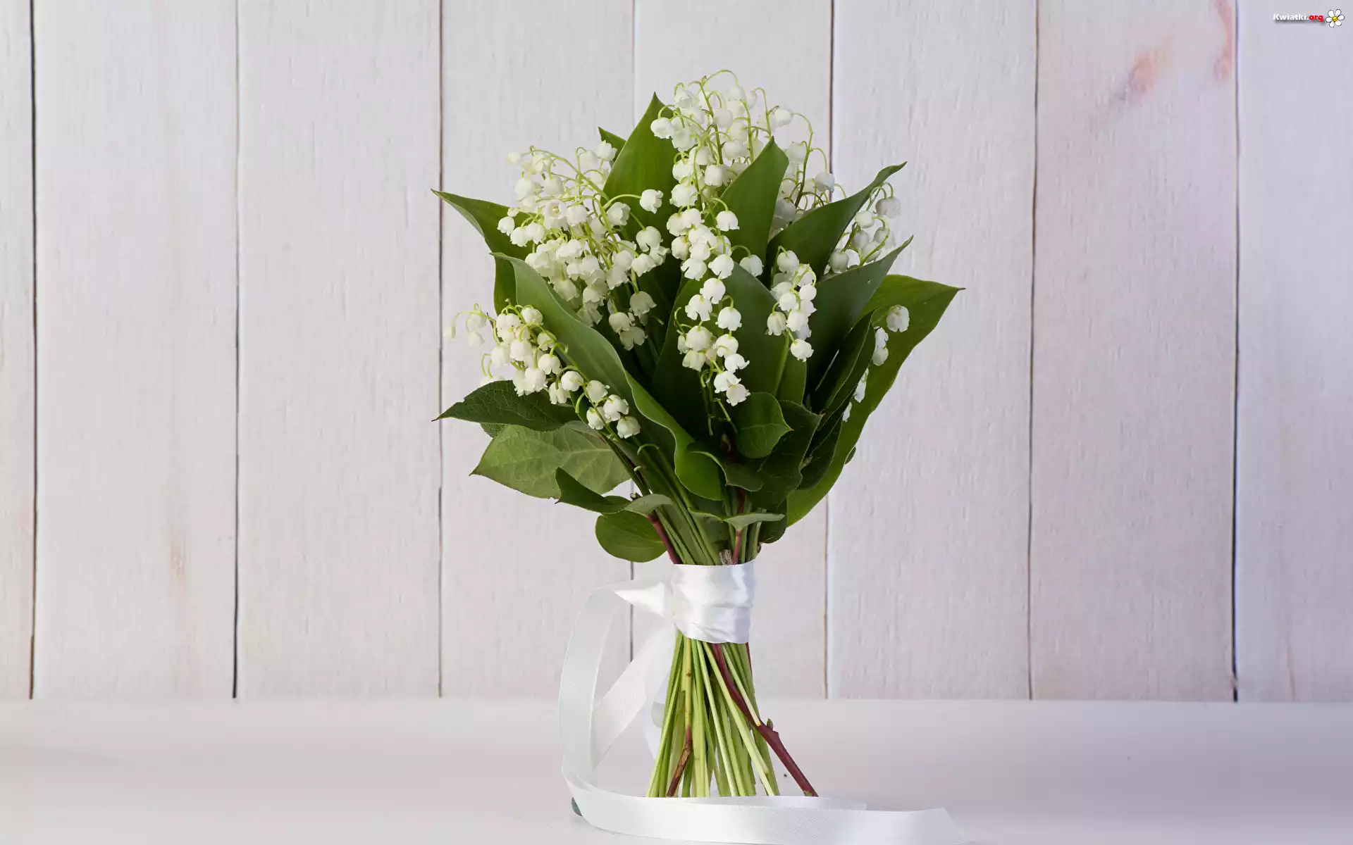 Kwiaty, Konwalie majowe, Bukiet, Wstążka biała, Deski - Zdjęcia
