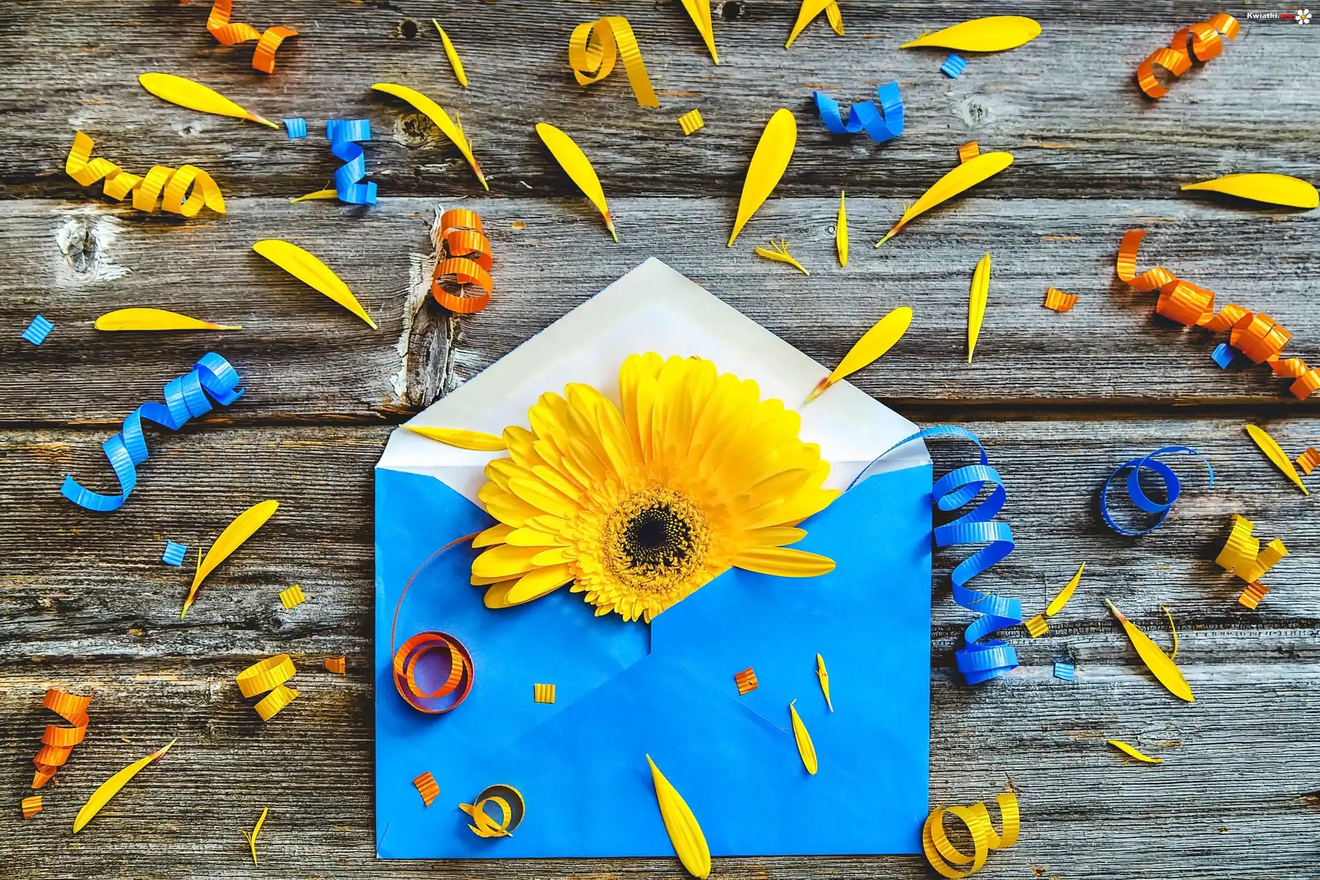 Koperta, Żółta, Gerbera, Płatki, Wstążeczki, Kompozycja - Zdjęcia