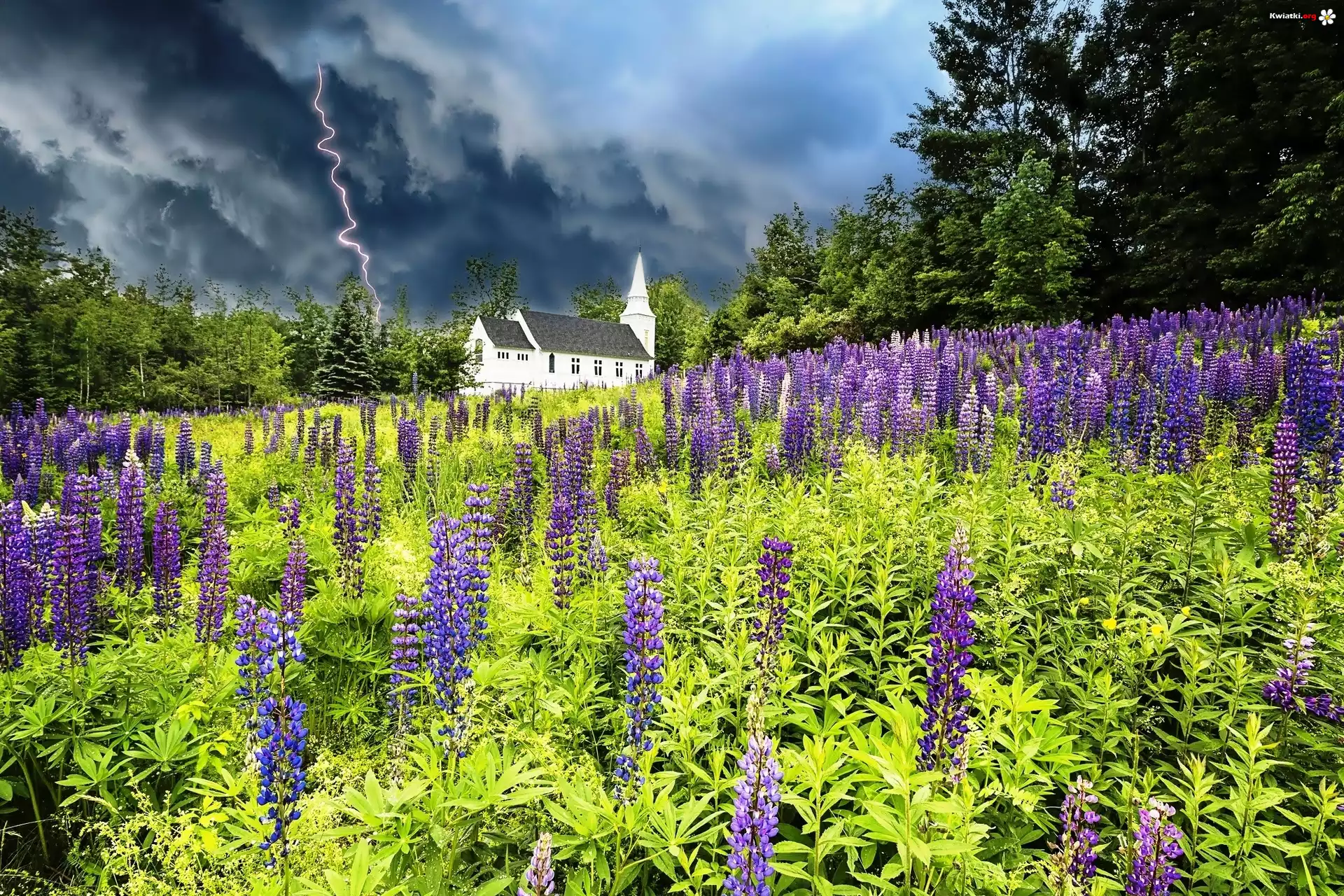 Kościół, Łąka, Łubin, Piorun - Zdjęcia