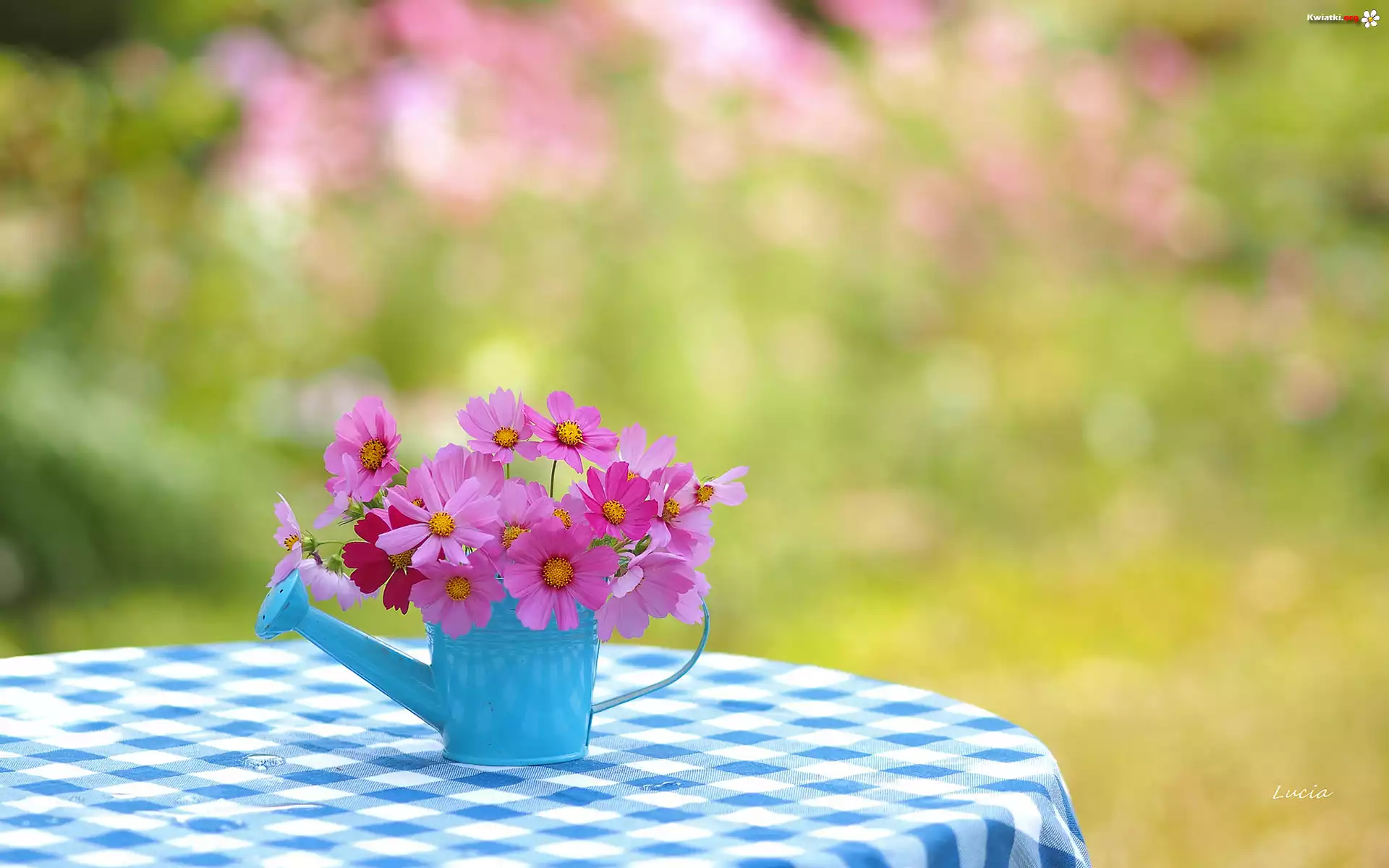 Bukiet, Kosmea, Niebieska, Konewka, Obrus, Rozmyte tło - Zdjęcia