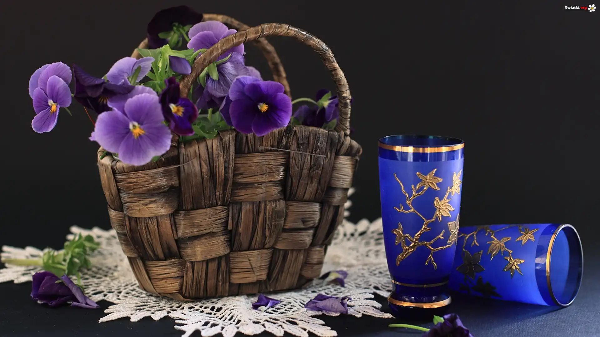 Koszyk, Fioletowe, Bratki, Szklaneczki - Zdjęcia