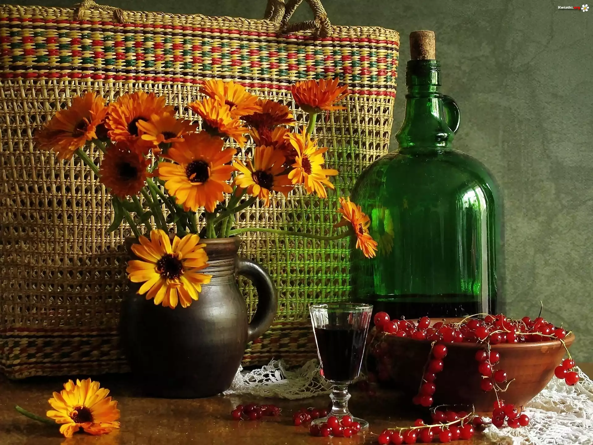 Koszyk, Dzbanek, Żółte, Gerbery, Butelka - Zdjęcia