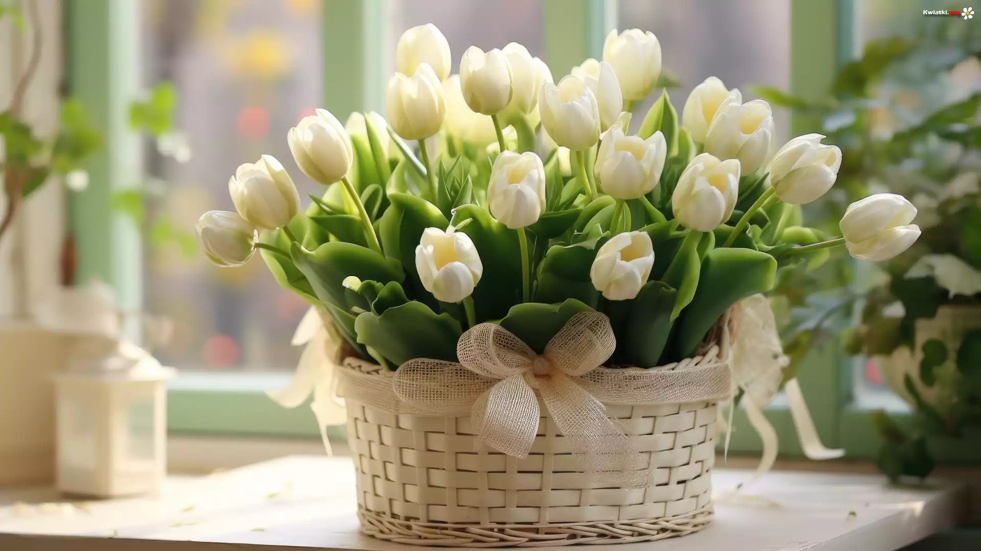 Kwiaty, Białe, Tulipany, Koszyk, Okno, Grafika - Zdjęcia