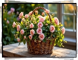 Kwiaty, Róże, Różowe, Koszyk, Stół, Okno - Zdjęcia