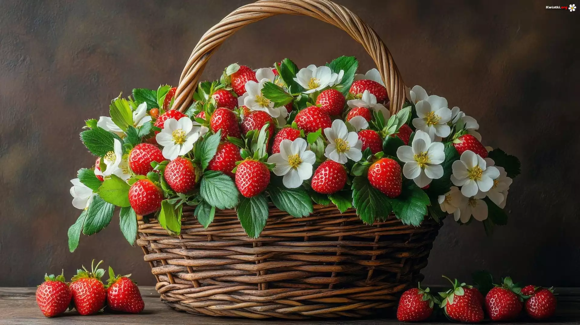 Koszyk, Kwiaty, Truskawki - Zdjęcia
