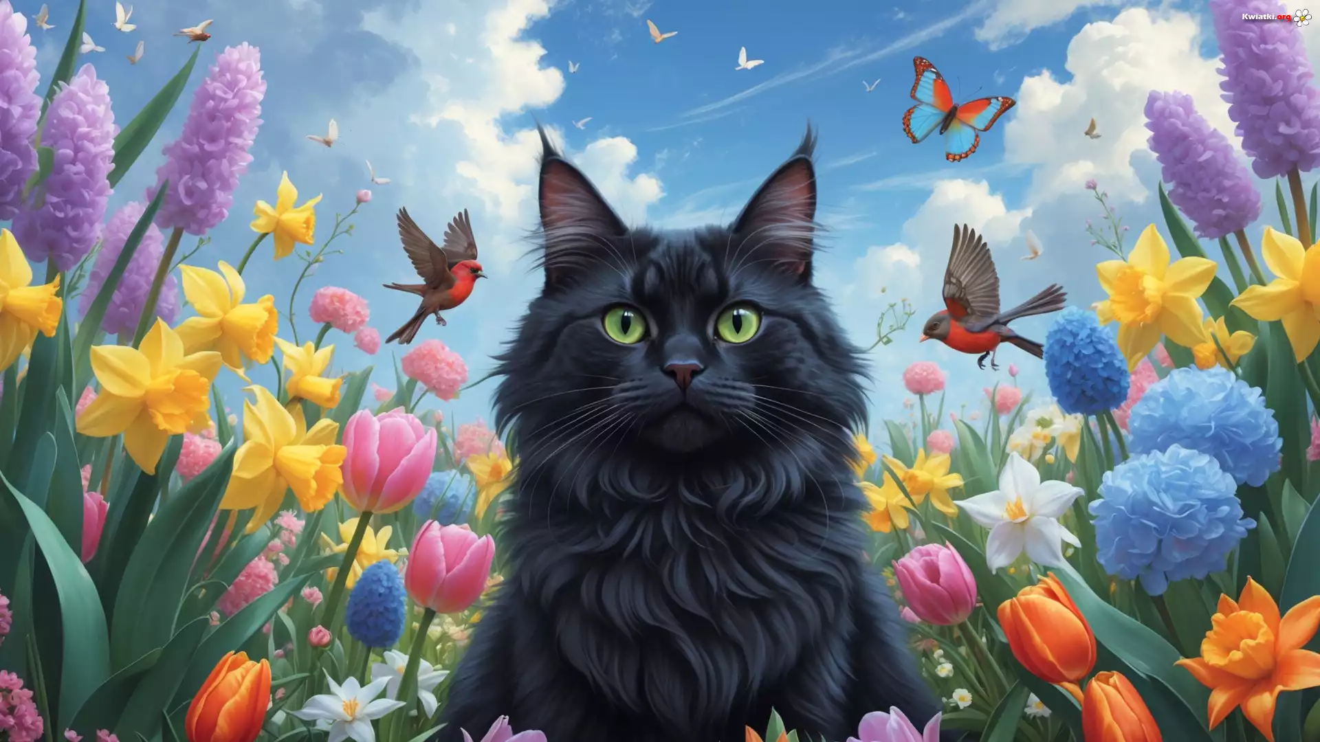 Czarny, Kot, Kolorowe, Kwiaty, Ptaki - Zdjęcia