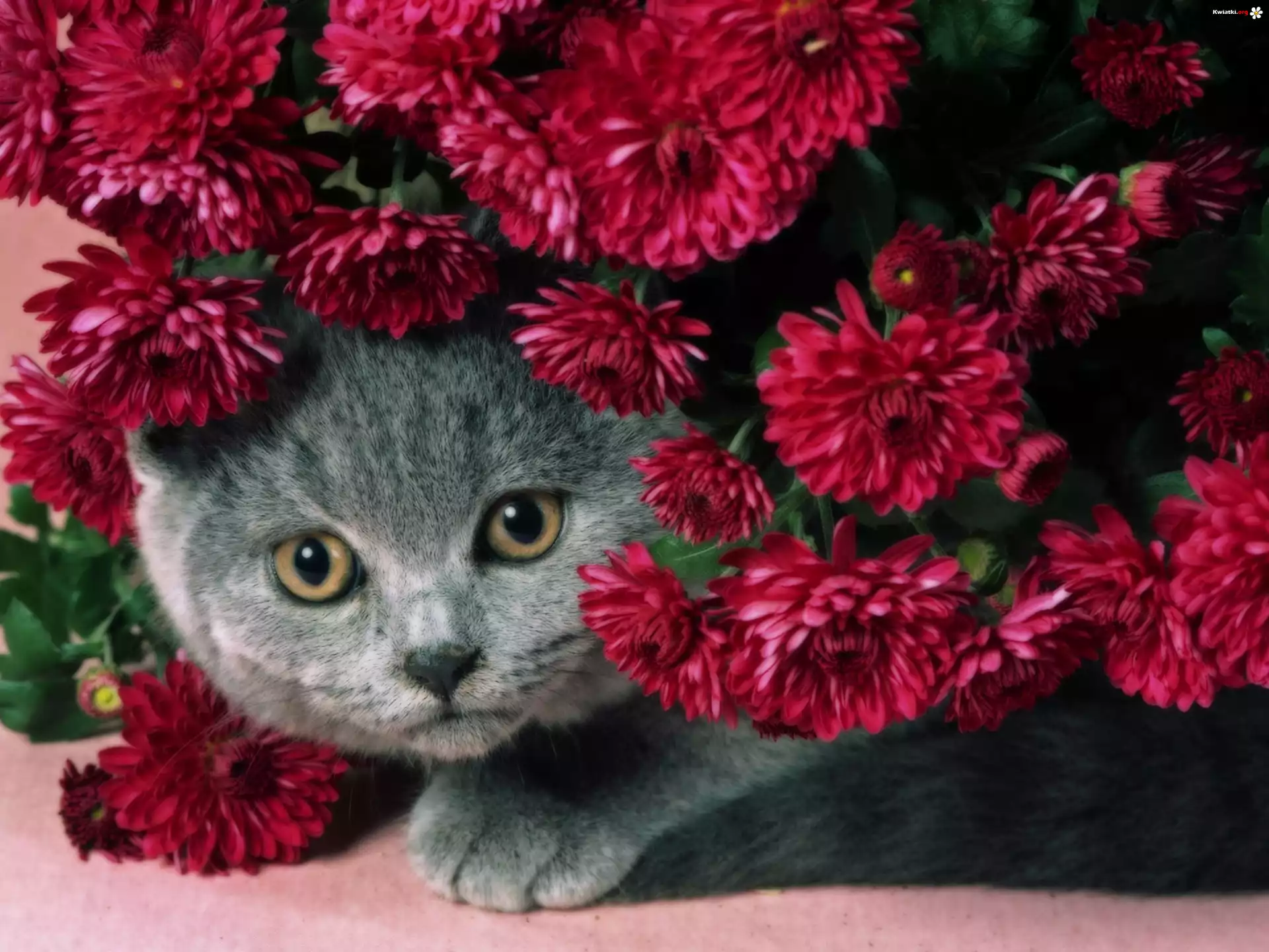 Szary, Kotek, Kwiatki, Chryzantema - Zdjęcia