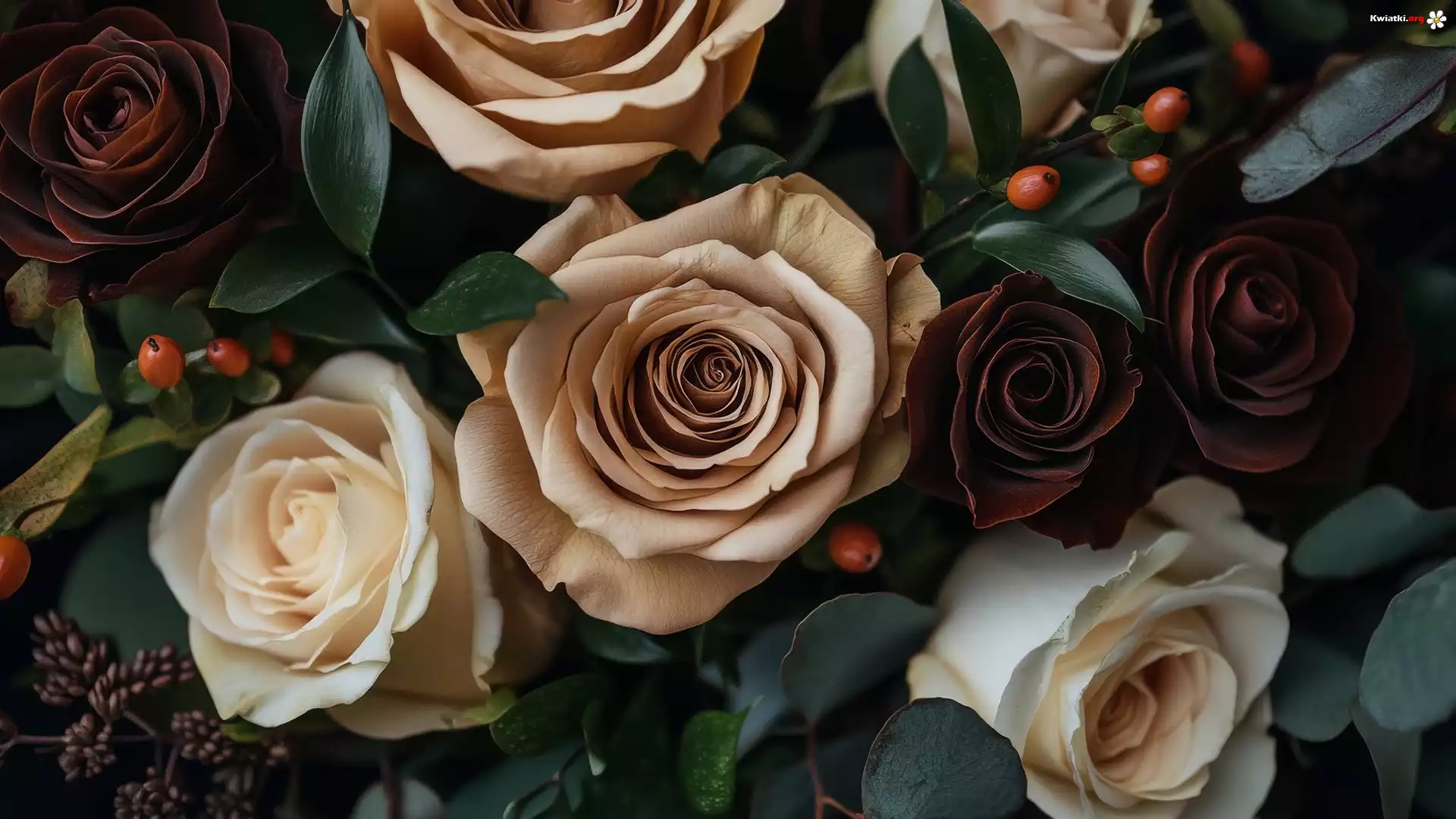 Brązowe, Kremowe, Róże, Zielone, Listki - Zdjęcia
