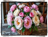 Kwiaty, Piwonie, Różowe, Kremowe, Koszyk, Stół - Zdjęcia