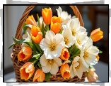 Kwiaty, Pomarańczowe, Tulipany, Kremowe, Kamelie, Wiklinowy, Koszyk - Zdjęcia