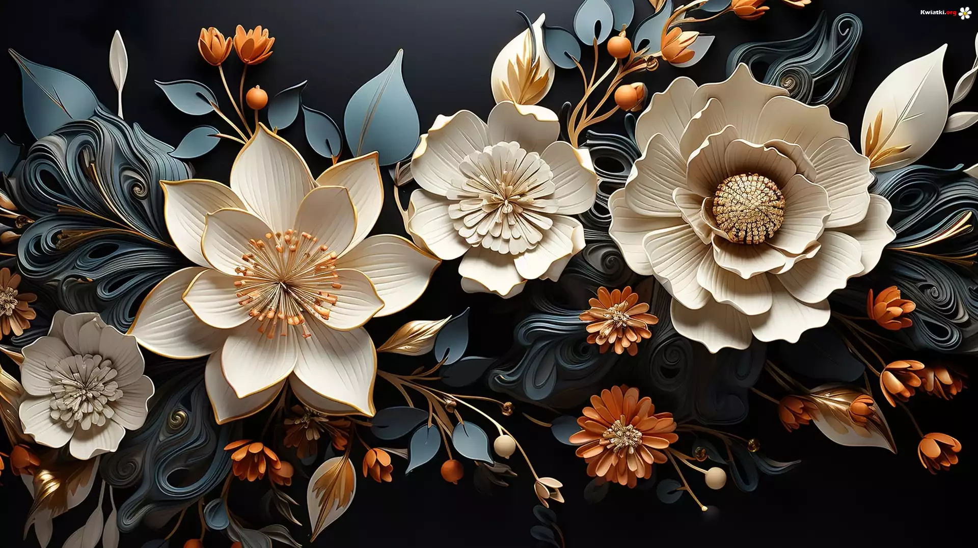 Kwiaty, Kremowe, Złocone, Liście, Grafika - Zdjęcia