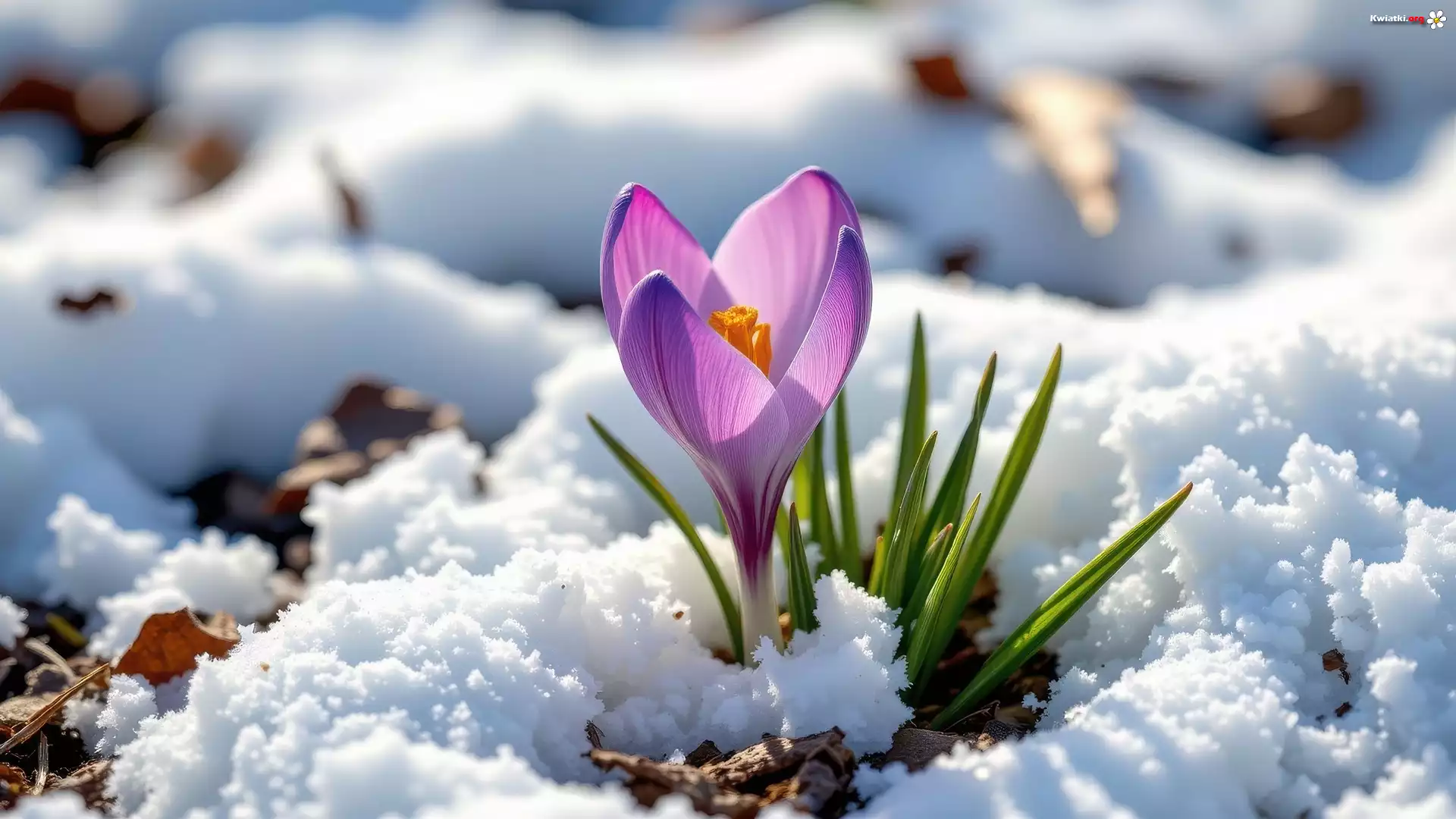 Kwiat Fioletowy, Krokus, Zielone, Listki, Śnieg