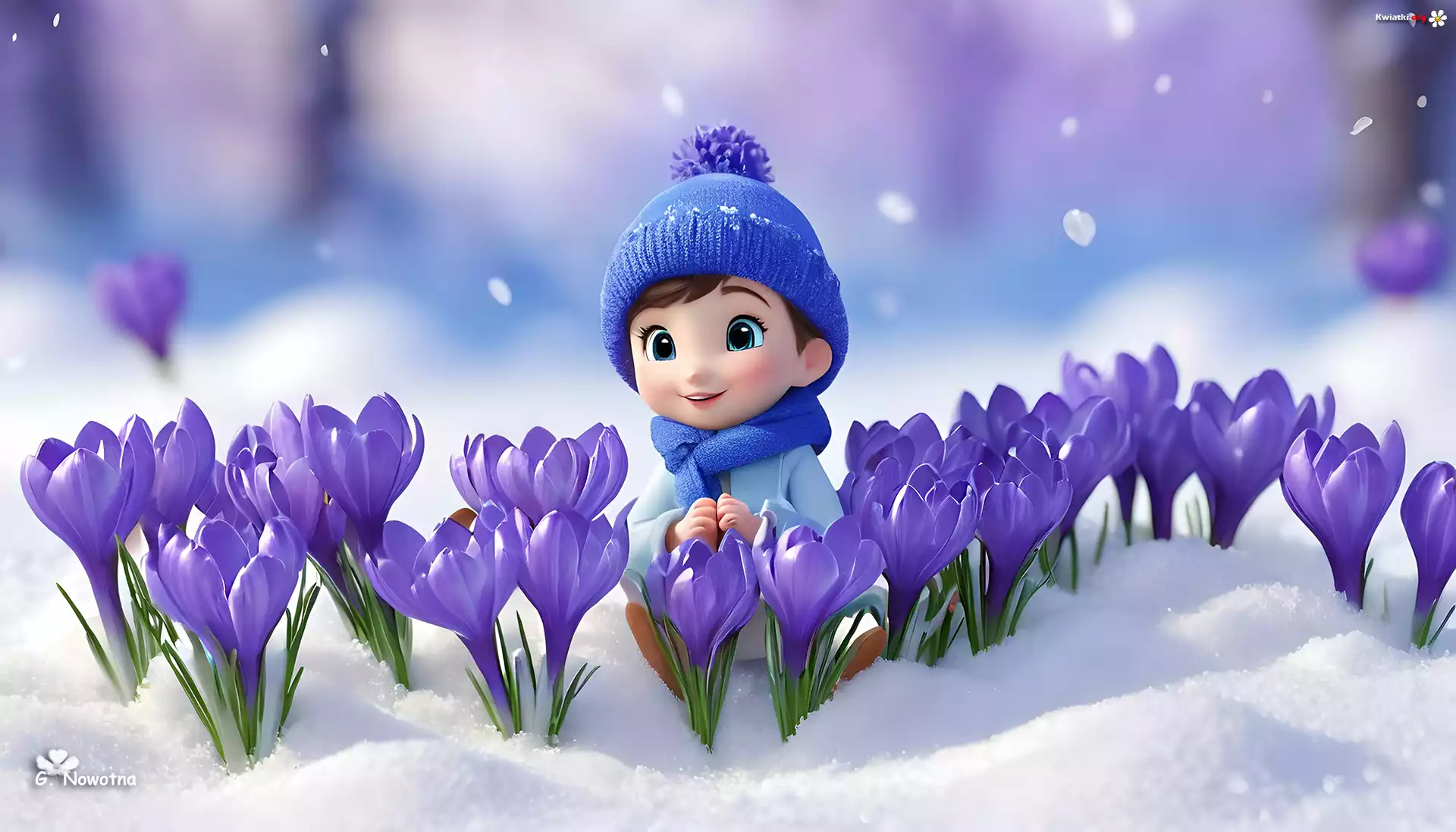 Kwiat Fioletowe, Krokusy, Chłopiec, Śnieg, Grafika