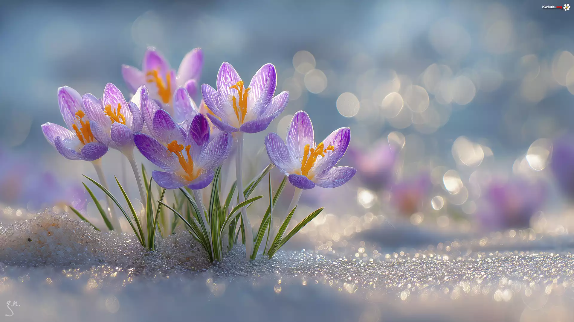Kwiaty, Kępka, Fioletowe, Krokusy, Śnieg, Grafika AI - Zdjęcia