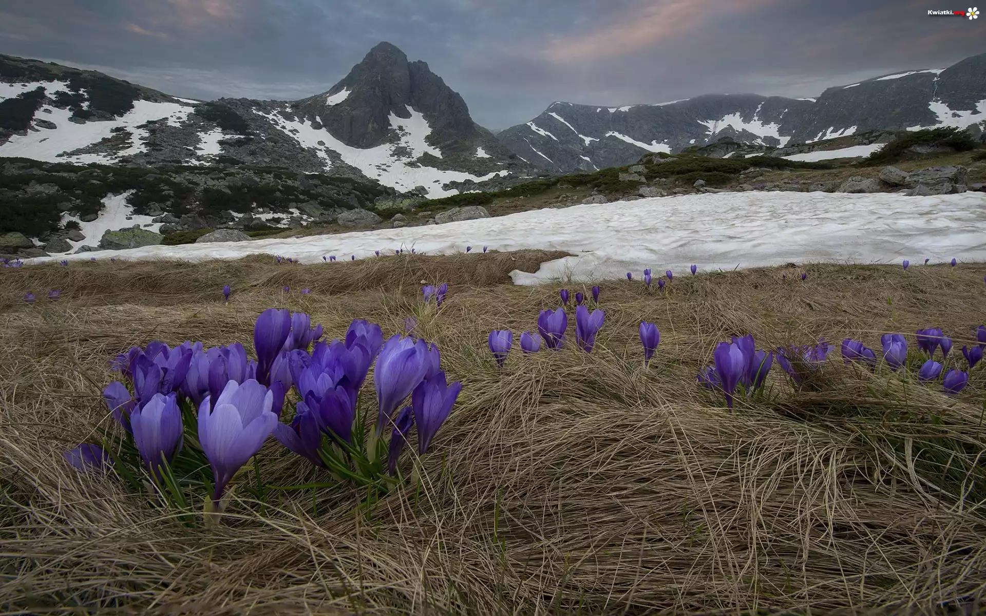 Bułgaria, Masyw górski Riła, Góry, Ośnieżone, Szczyty, Wiosna, Kwiaty, Krokusy - Zdjęcia