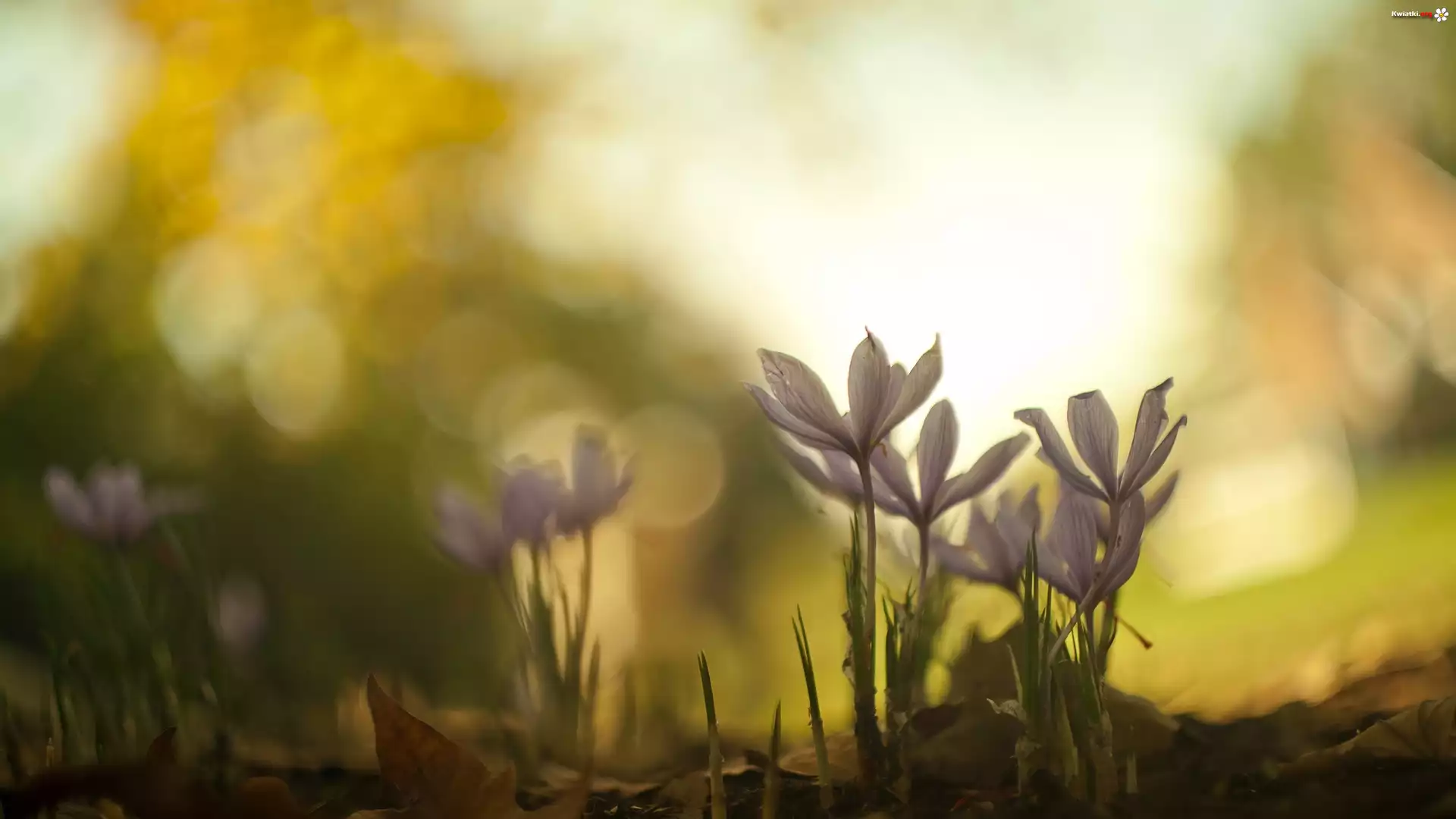 Krokusy, Liście, Rozmyte tło - Zdjęcia