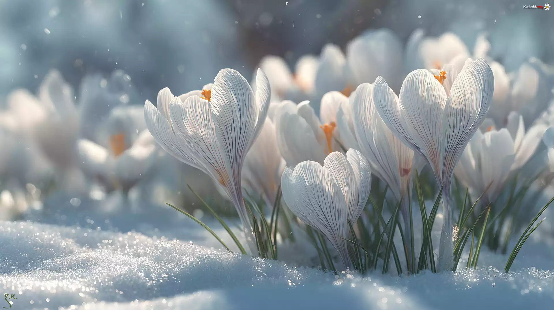 Kwiat Białe, Krokusy, Śnieg, Grafika AI