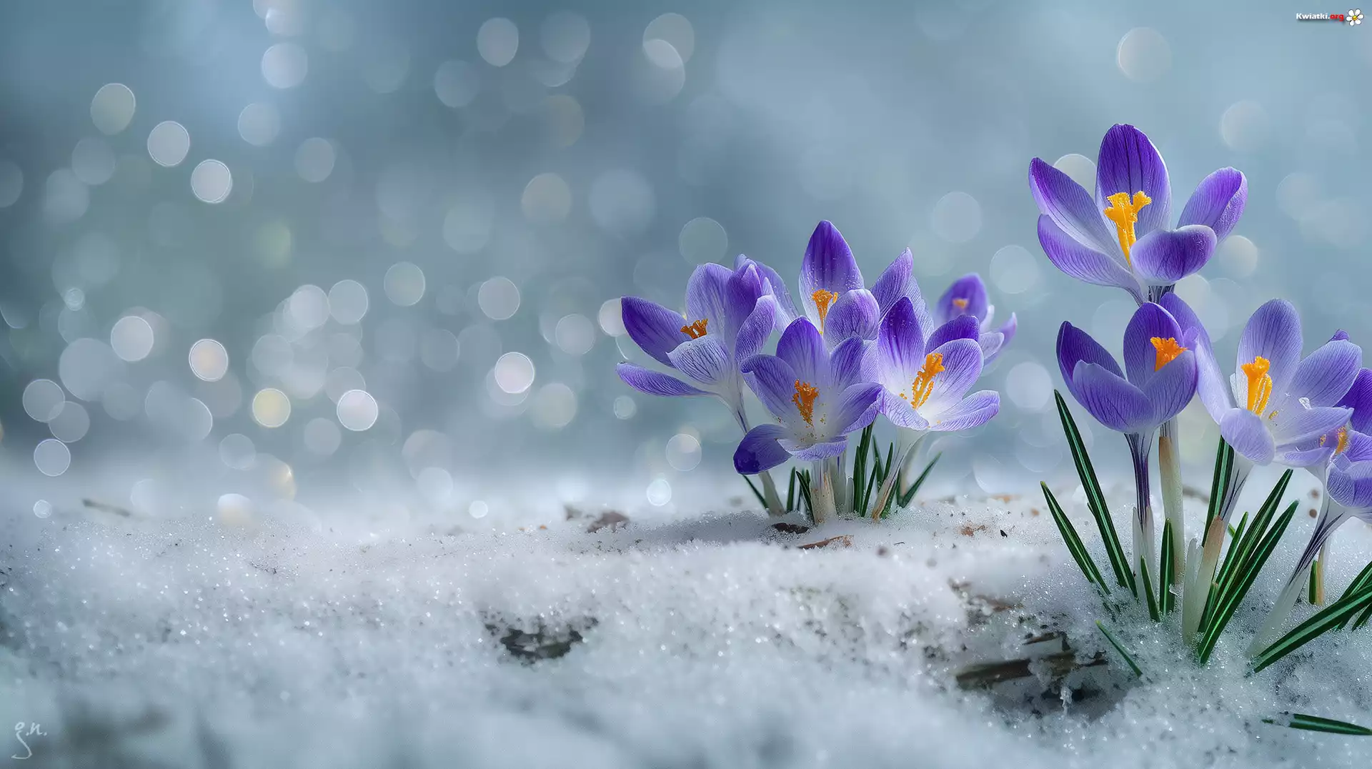 Kwiat Fioletowe, Krokusy, Śnieg, Grafika AI