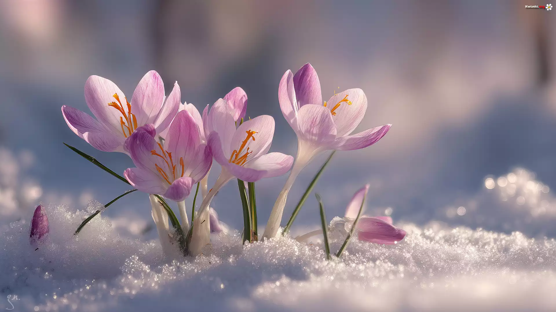 Kwiat Różowe, Krokusy, Śnieg, Grafika AI