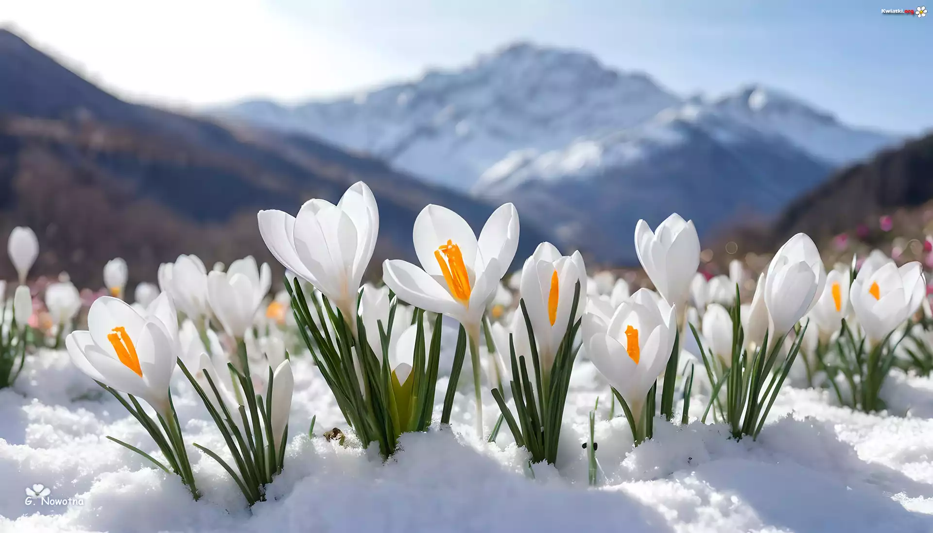 Kwiat Białe, Krokusy, Śnieg, Góry, Grafika