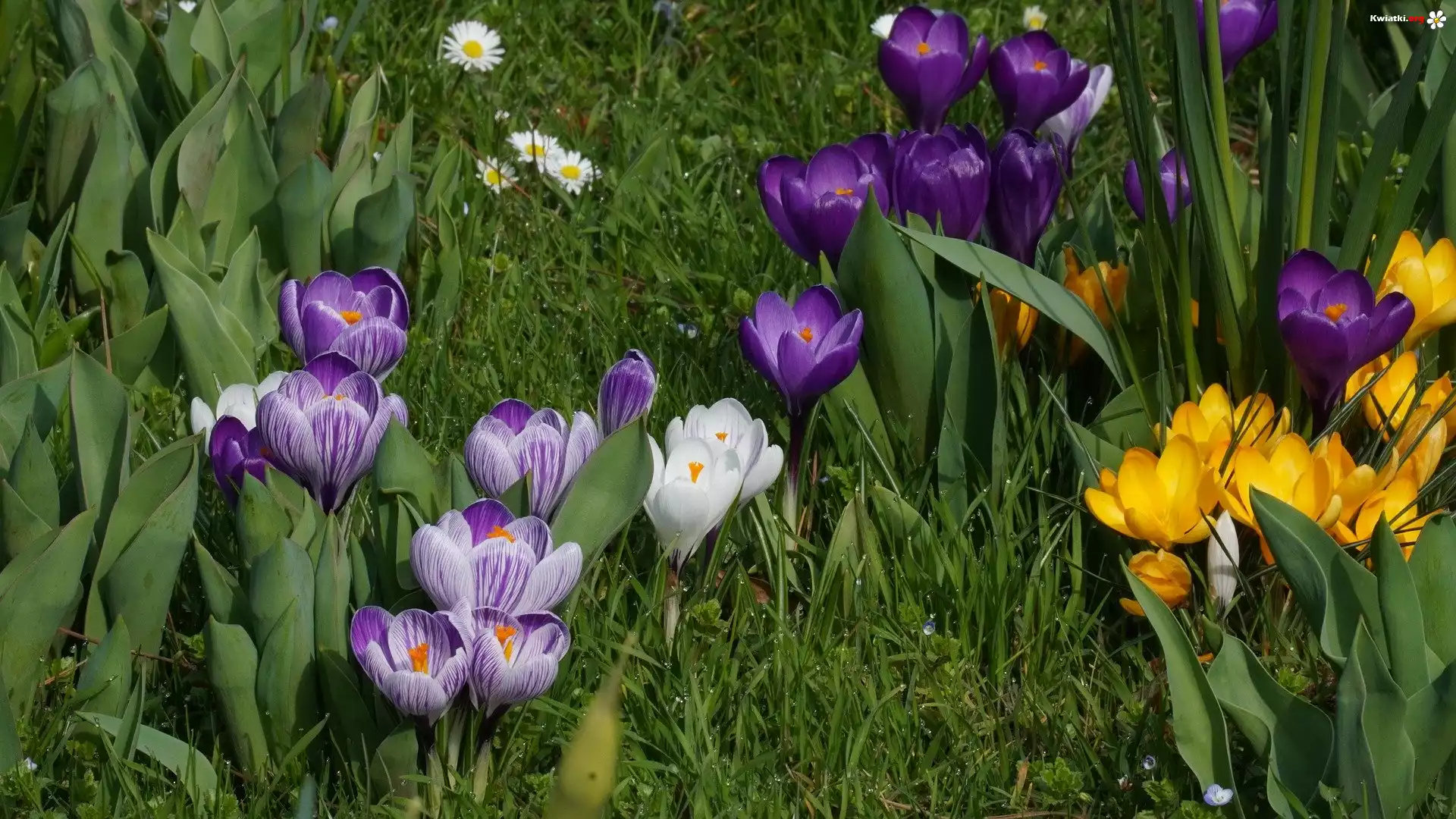 Krokusy, Stokrotki, Trawa - Zdjęcia