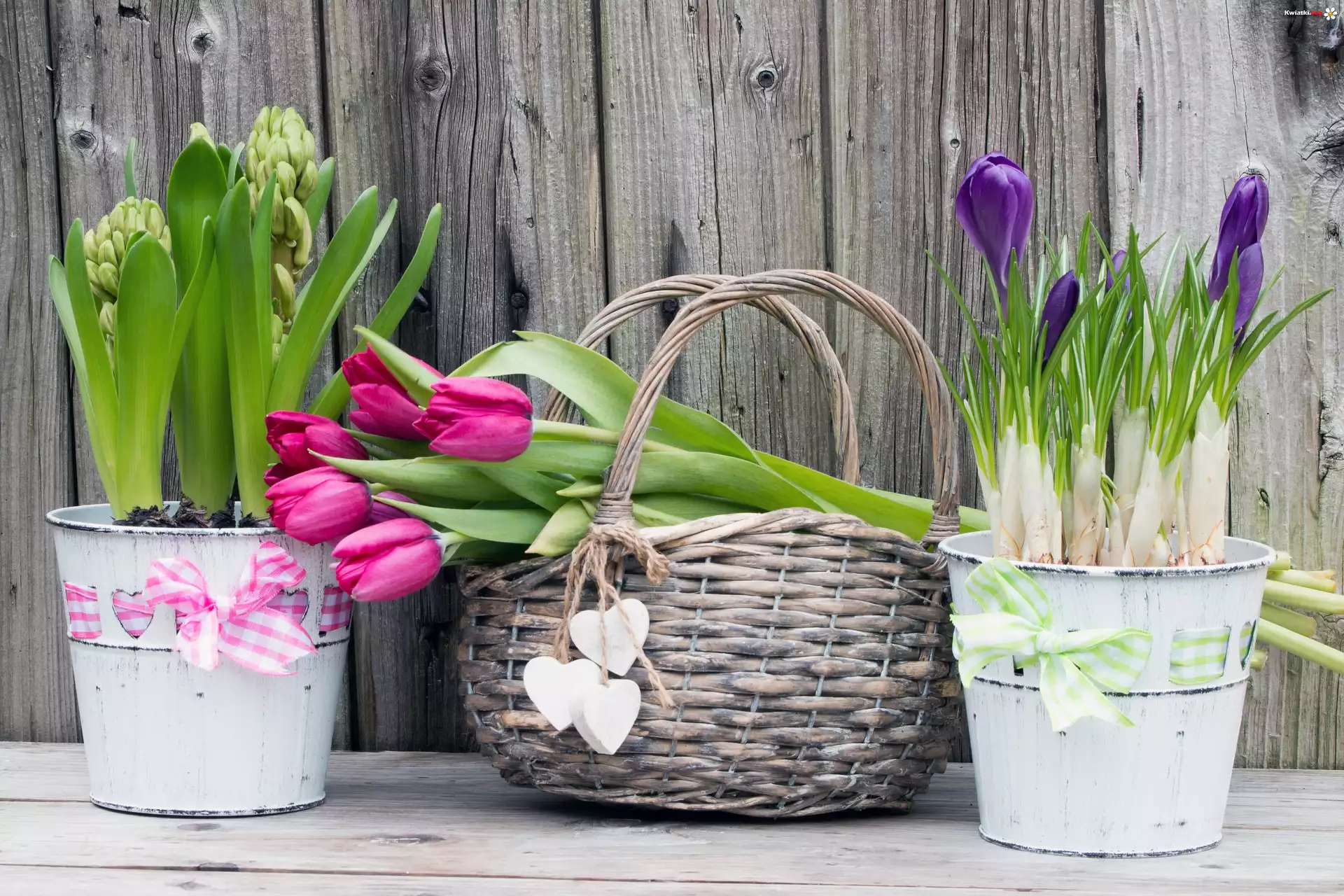 Krokusy, Hiacynty, Wiaderka, Tulipany, Kosz - Zdjęcia