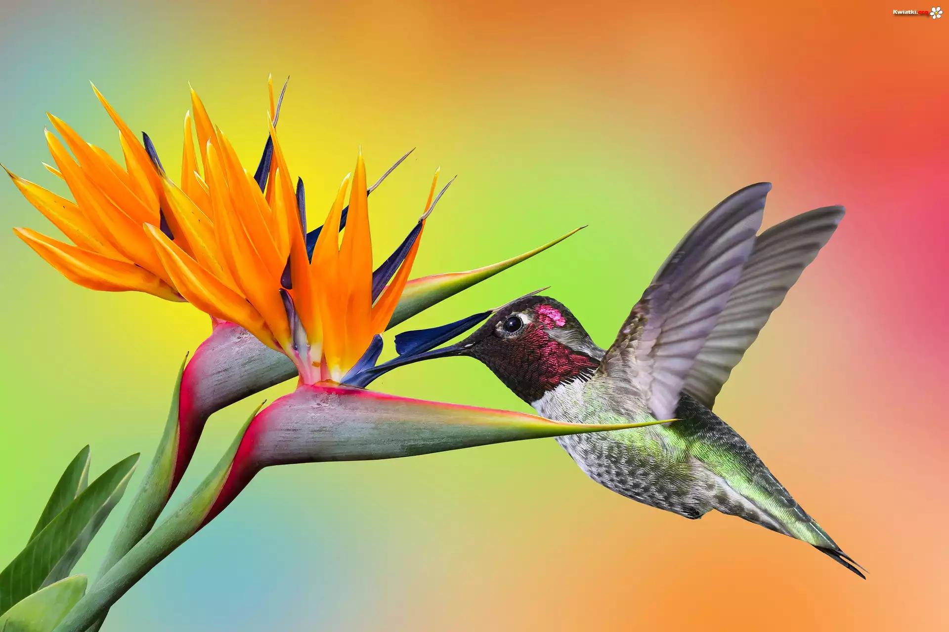 Koliber, Kwiat, Strelicja królewska, Kolorowe tło - Zdjęcia