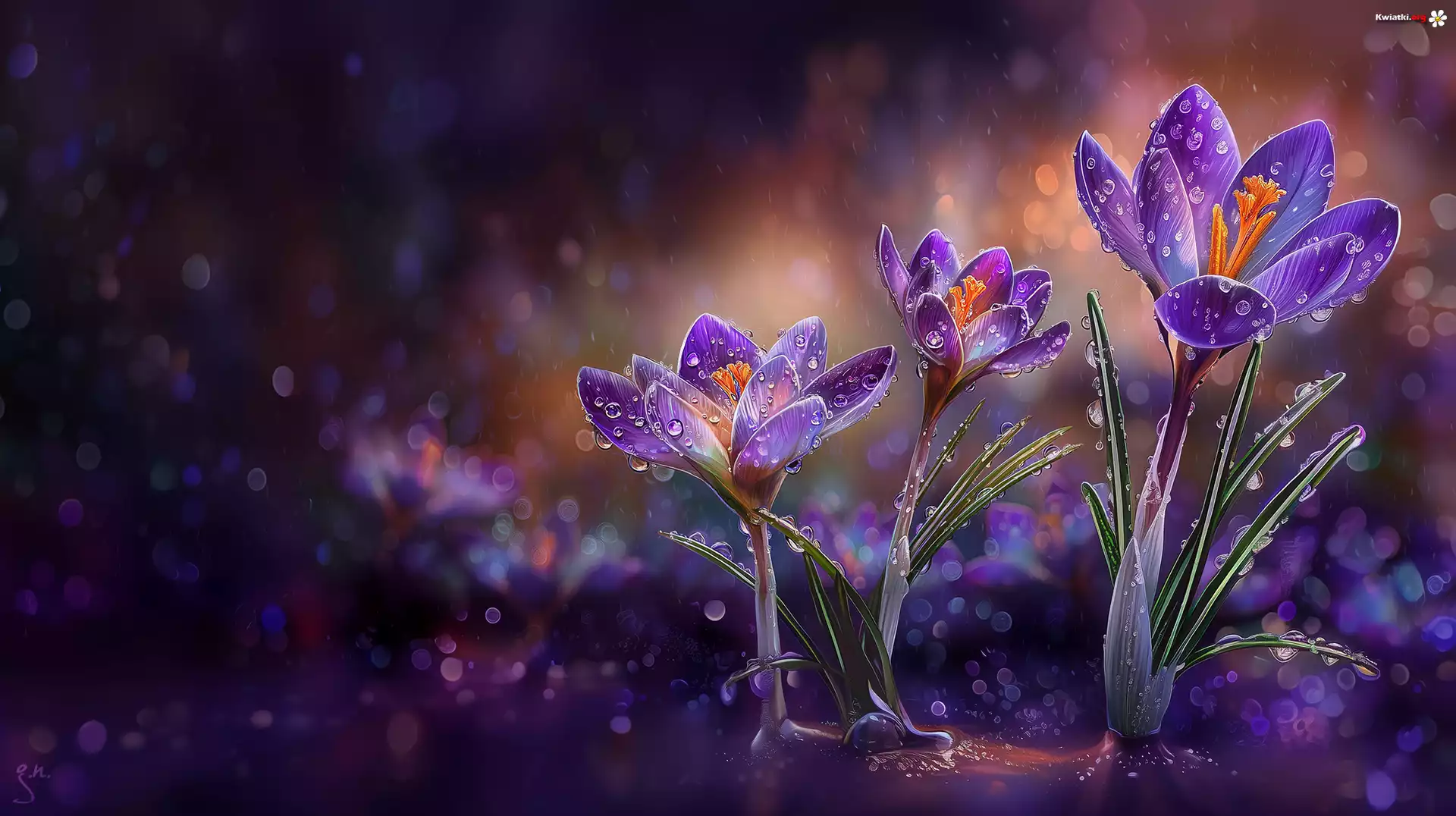 Kwiat Fioletowe, Krokusy, Kwiaty, Krople, Grafika AI