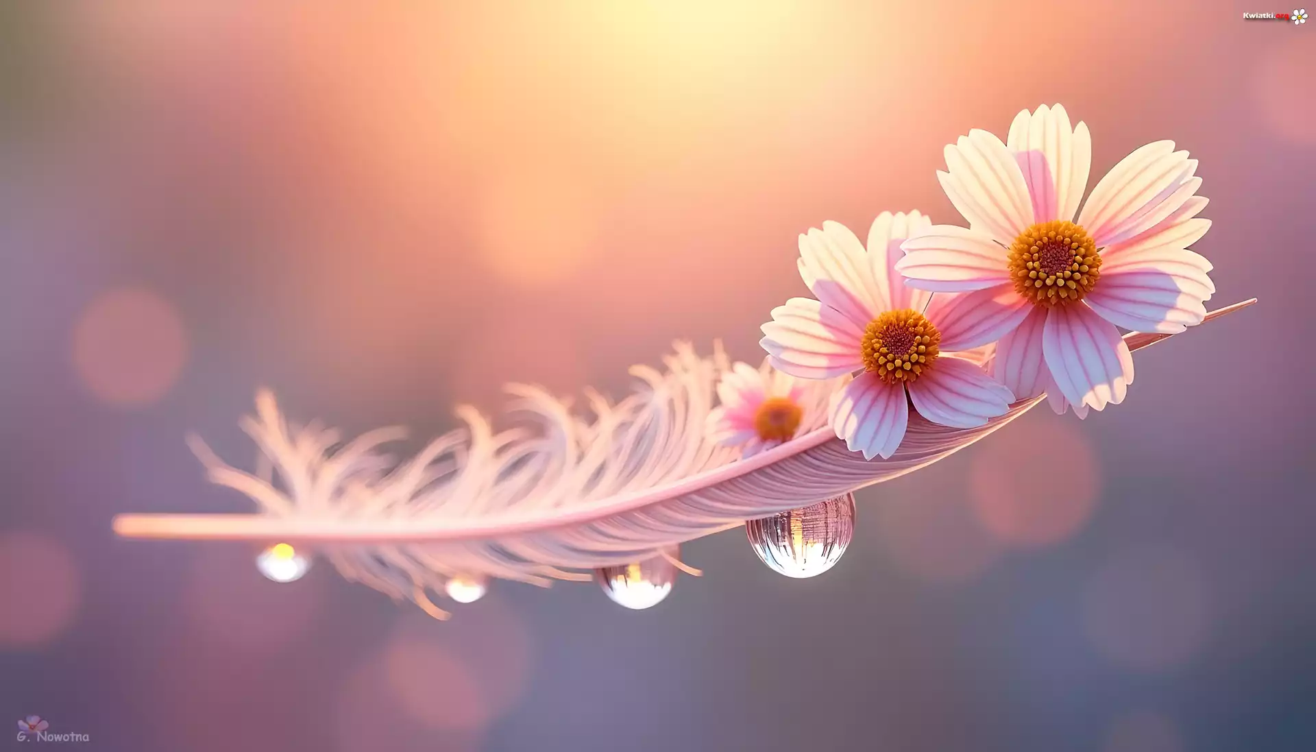 Różowe, Kwiaty, Piórko, Krople, Grafika AI - Zdjęcia