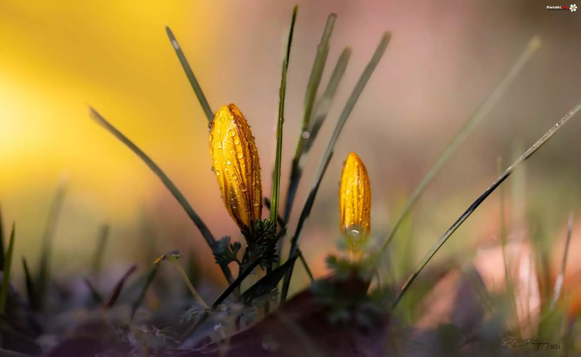 Kwiaty, Żółte, Krokusy, Krople - Zdjęcia