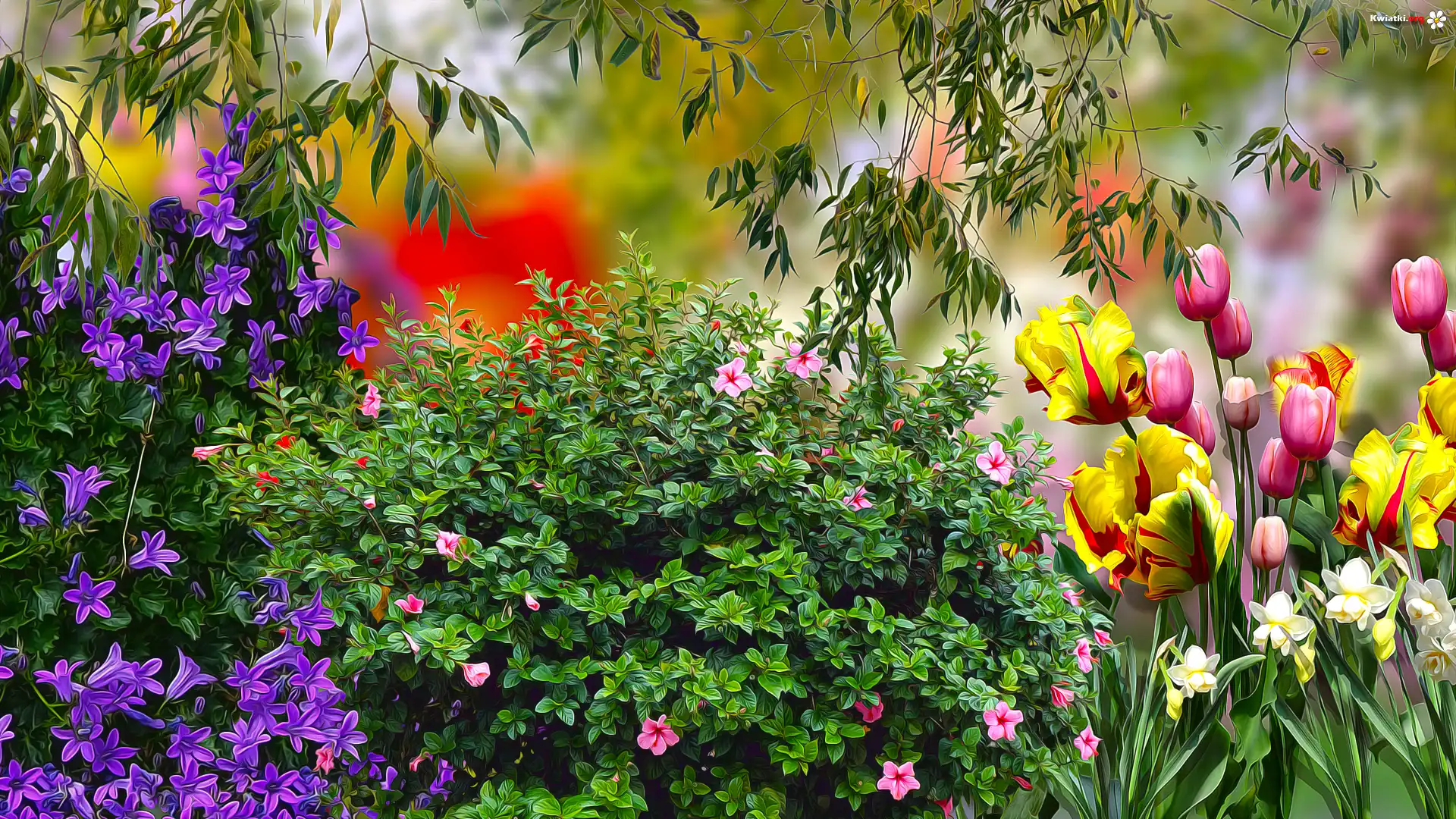 Krzewy, Kwiaty, Tulipany, Narcyzy, Grafika - Zdjęcia