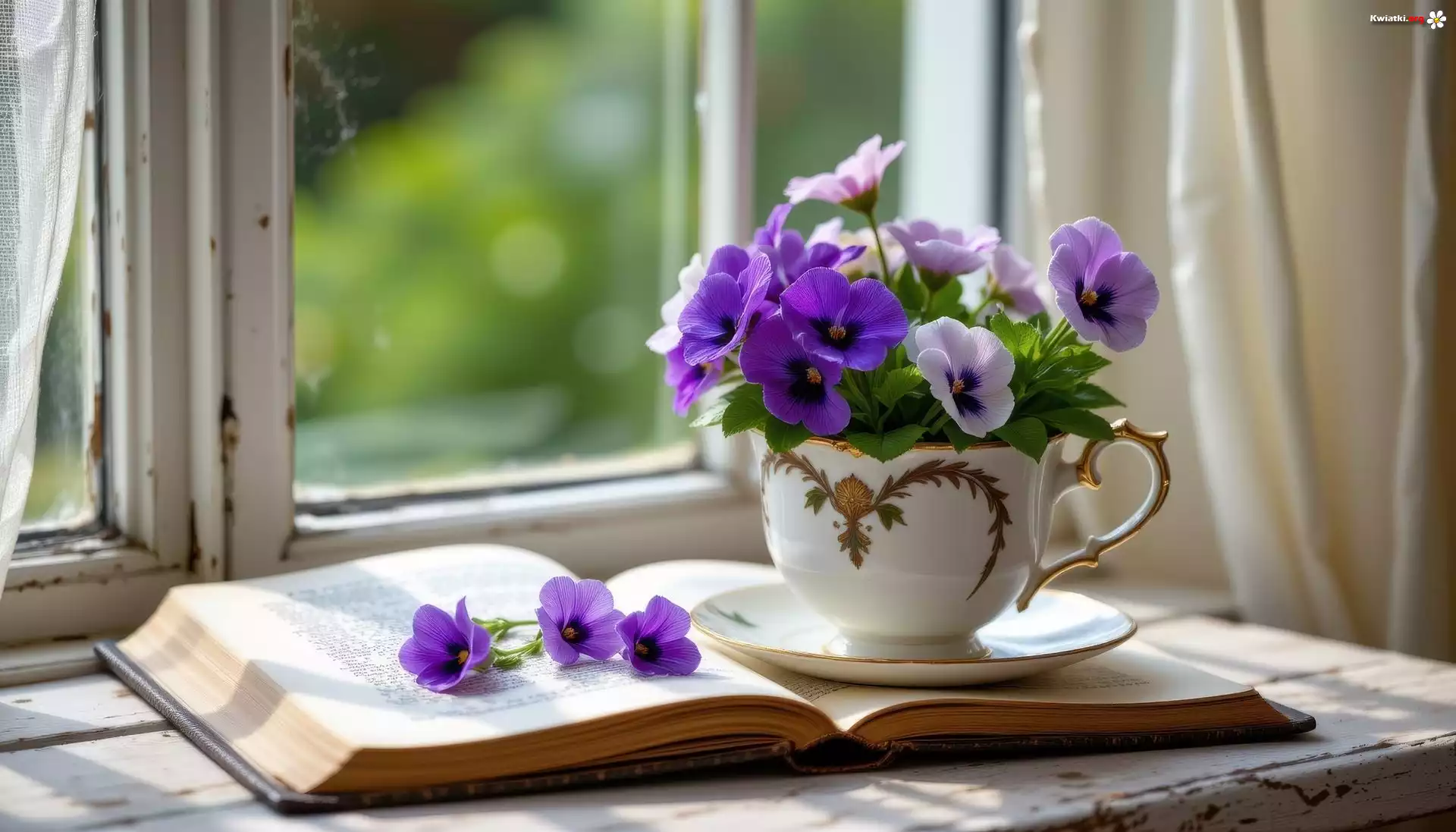 Kwiat Kwiaty, Bratki, Filiżanka, Książka, Parapet, Okno