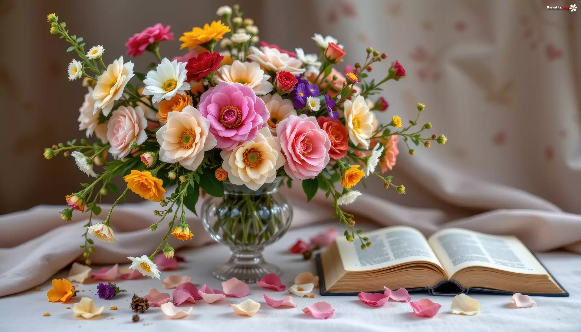 Kwiaty, Bukiet, Wazon, Książka, Tkanina, Grafika AI - Zdjęcia