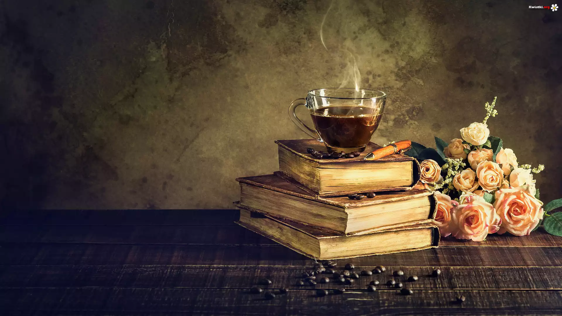 Kwiat Książki, Bukiet, Róże, Filiżanka, Kawa, Długopis