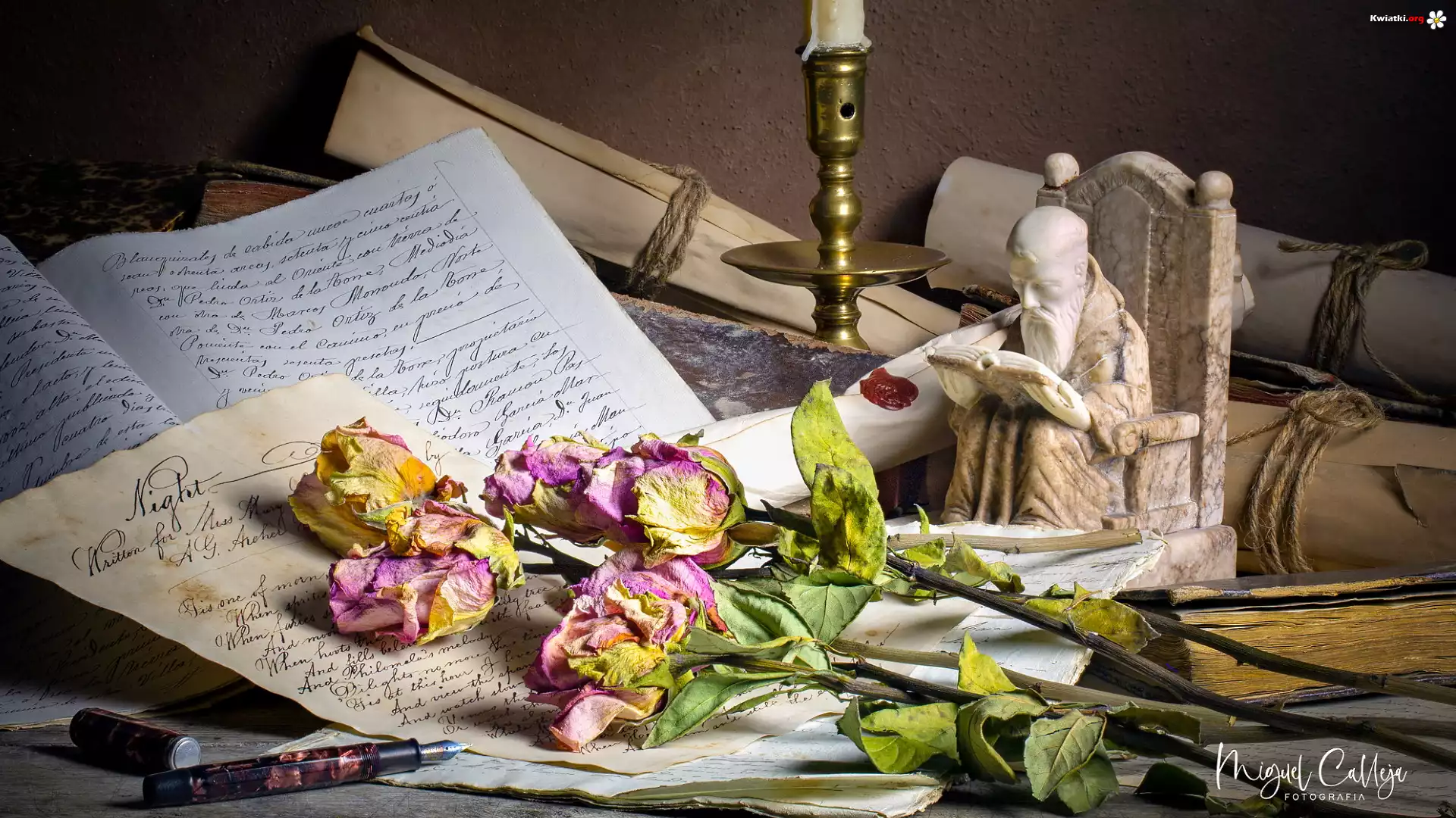 Kompozycja, Suche, Kwiaty, Róże, Figurka, Listy, Pióro, Świeca, Książki - Zdjęcia