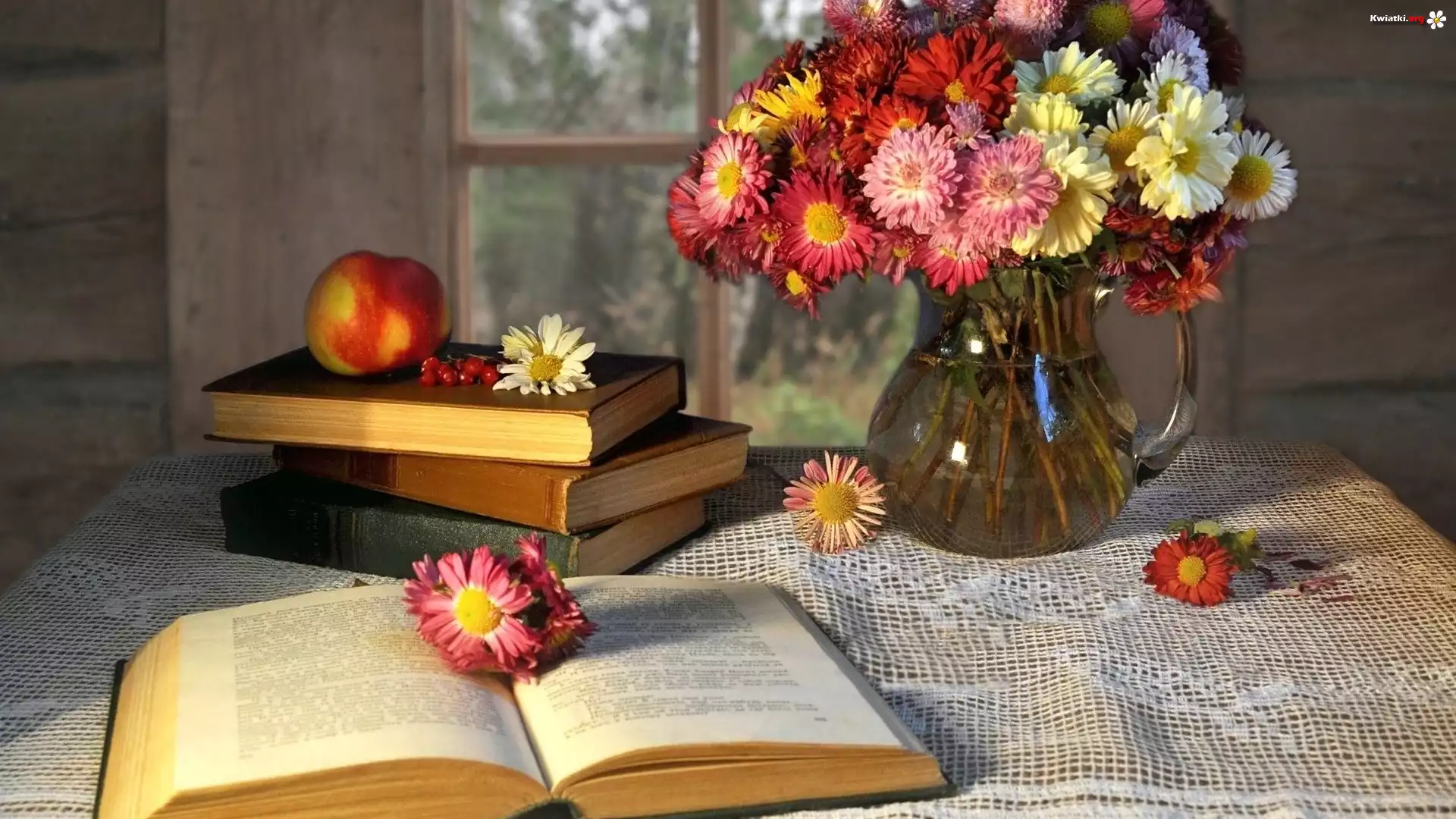Książki, Bukiet, Kwiatów, Wazon, Serweta - Zdjęcia
