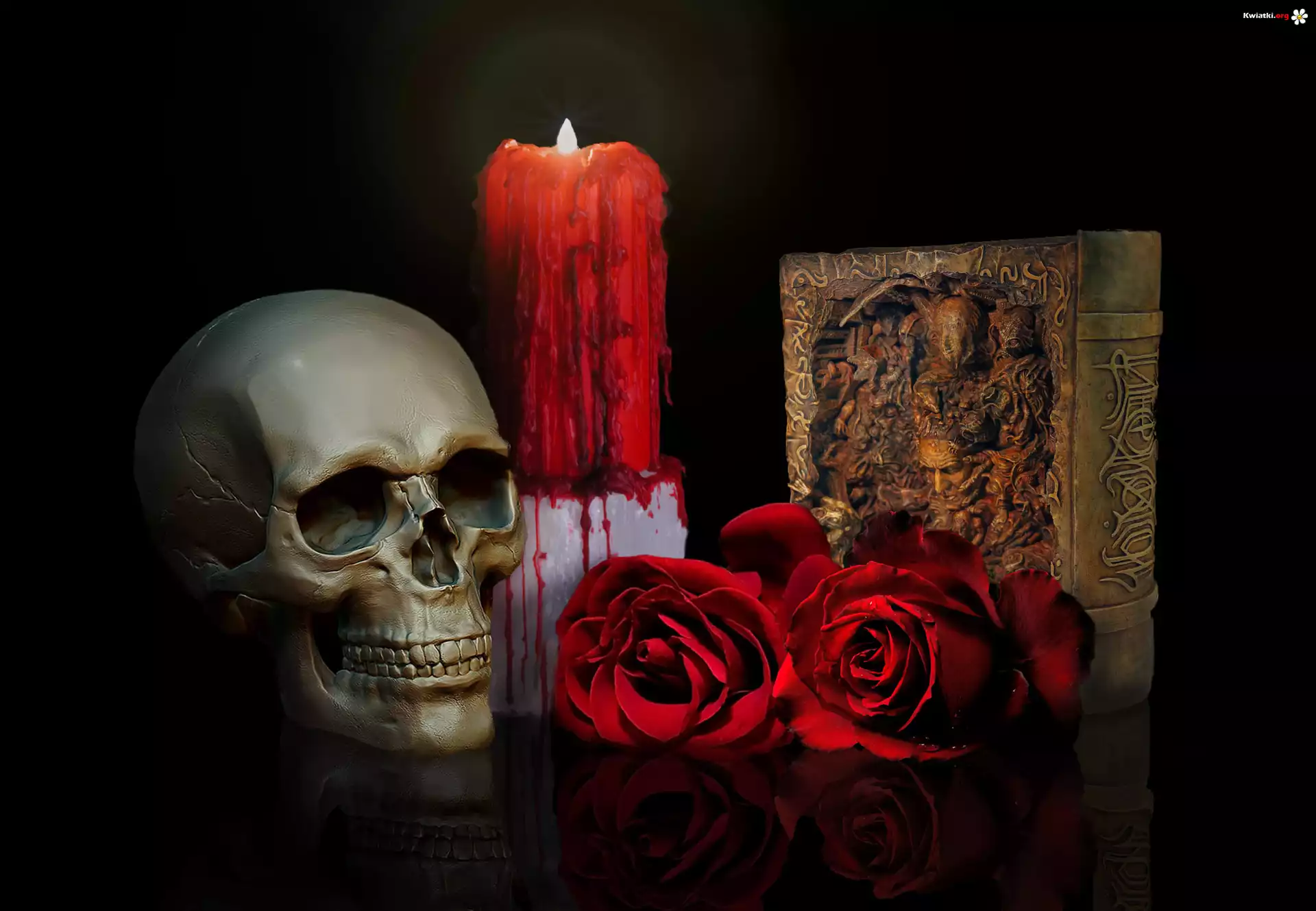 Księga, Świeca, Czaszka, Róże - Zdjęcia