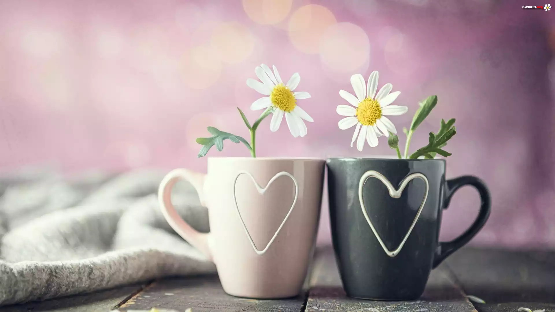 Dwa, Kubki, Serduszka, Kwiaty, Margerytki, Jastruny, Kompozycja - Zdjęcia