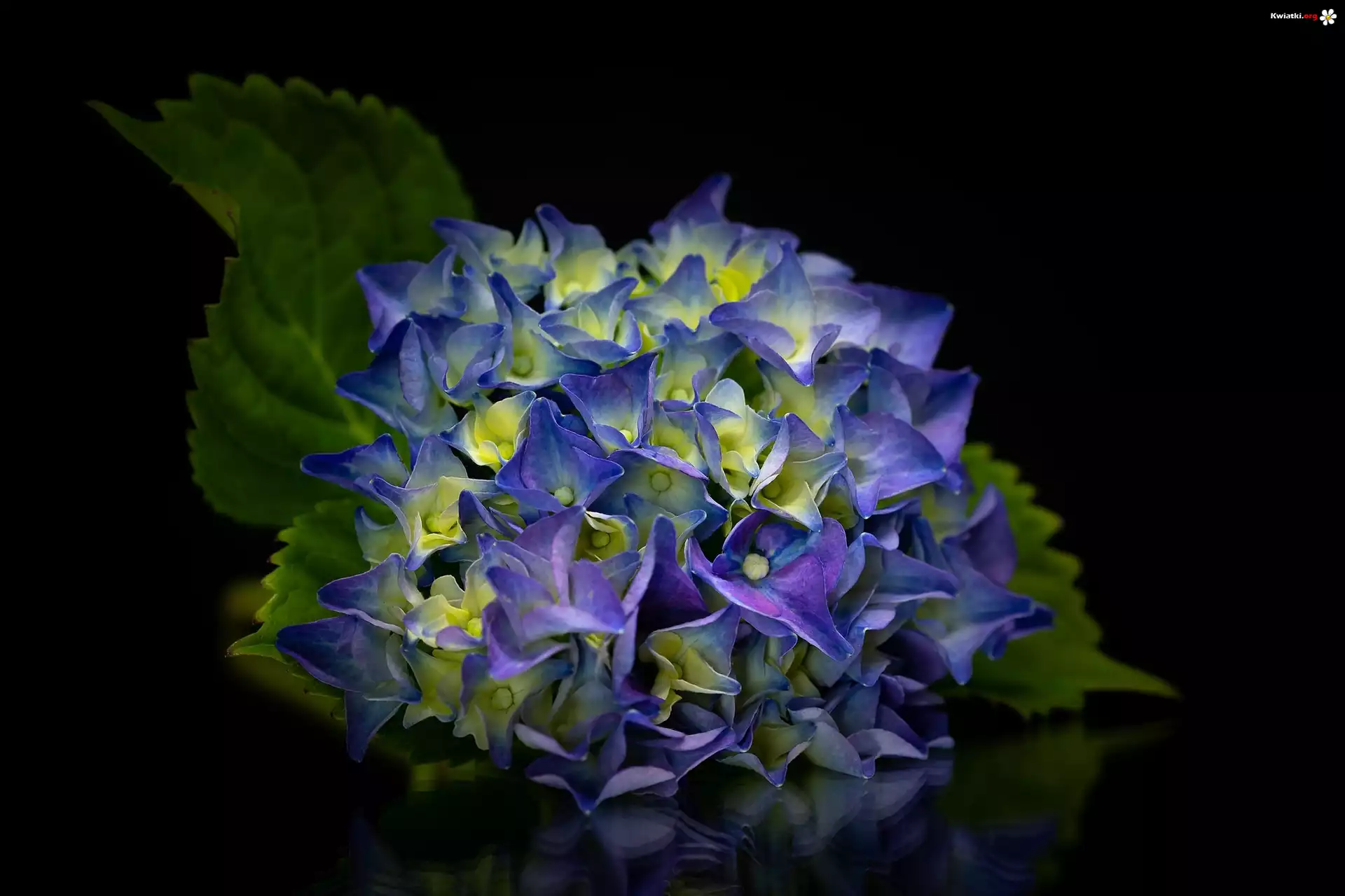 Kwiat Kwiat, Hortensja, Niebieska, Liście, Ciemne tło