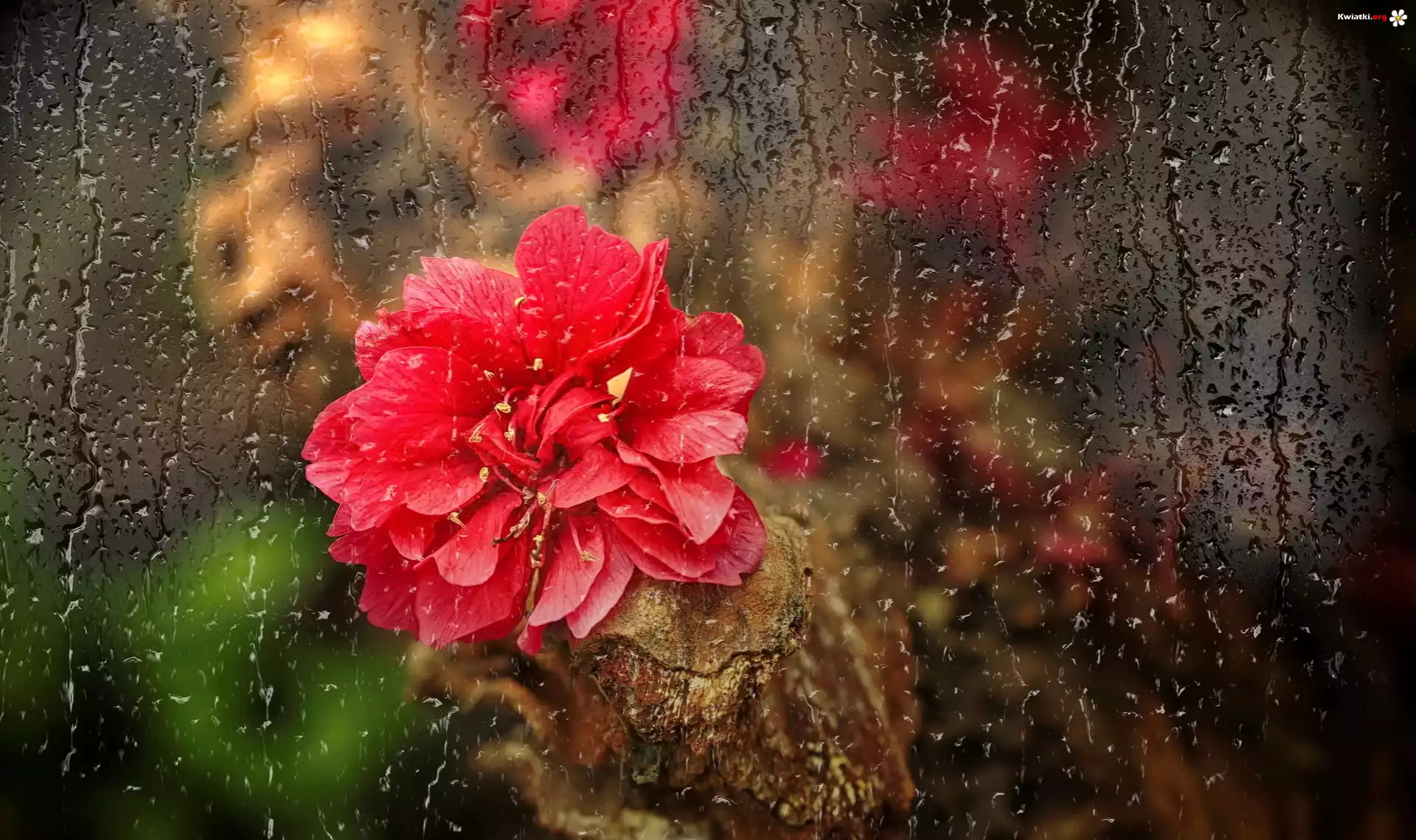 Czerwony, Kwiat, Szyba, Spływające ,Krople, Deszczu ,Odbicie - Zdjęcia
